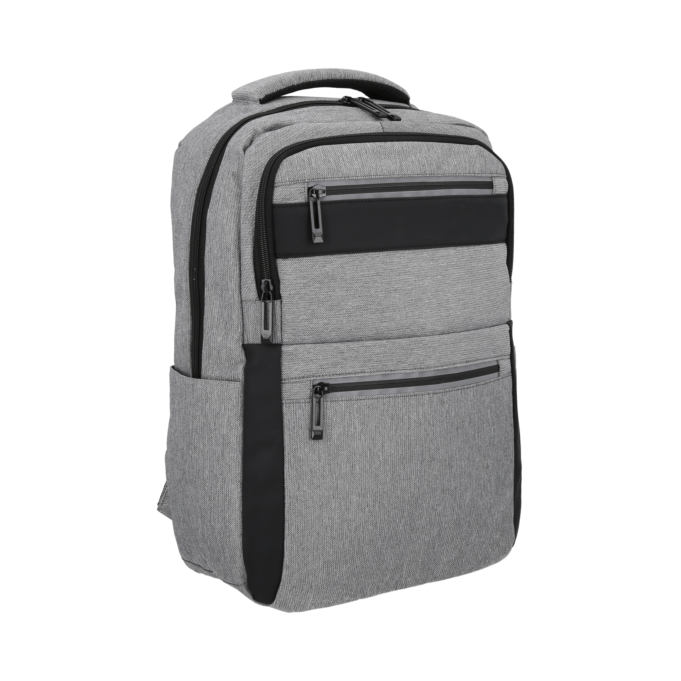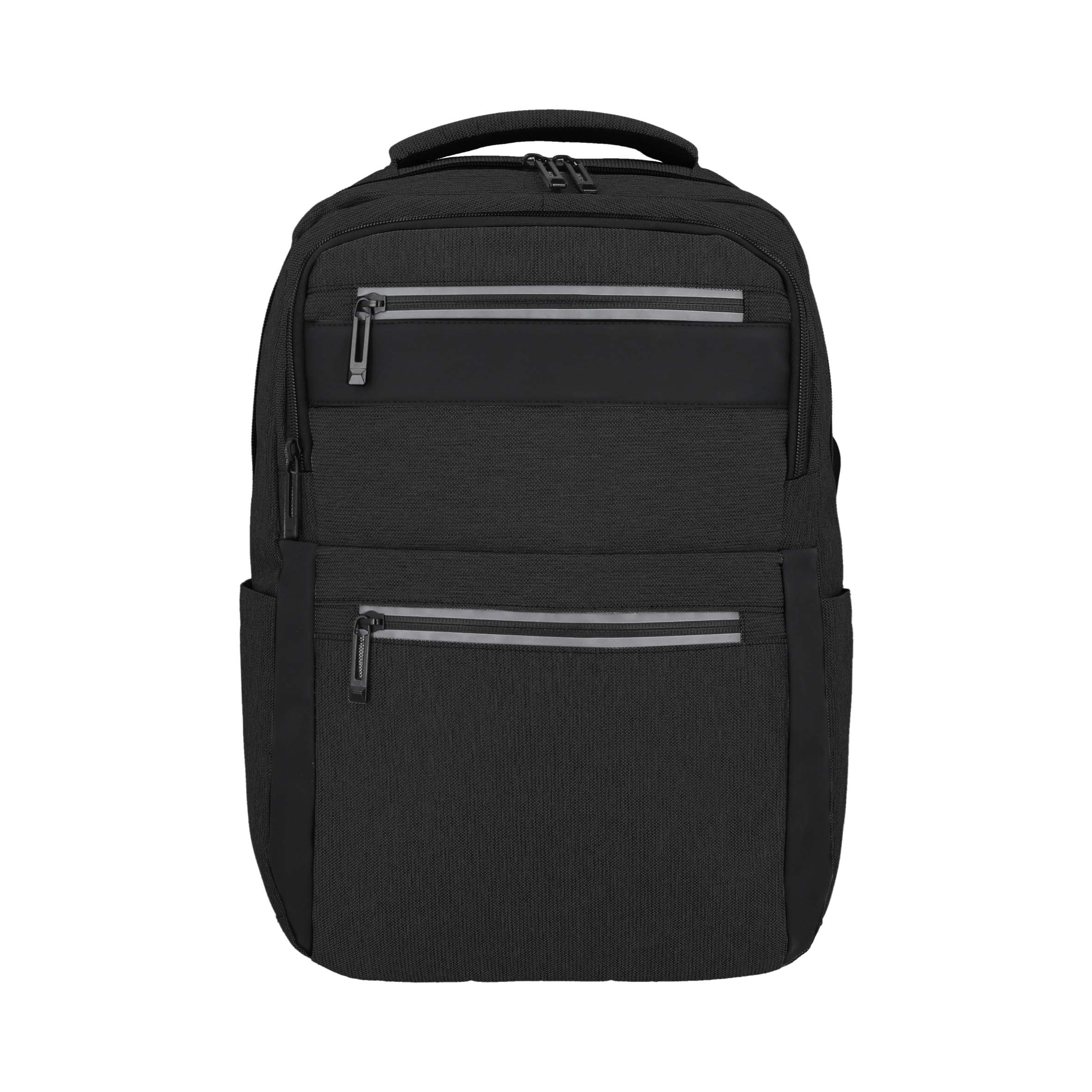 Mochila con 1 compartimento principal, porta laptop de 16″, 2 bolsas laterales, 3 bolsas frontales, asa y puerto de carga USB.