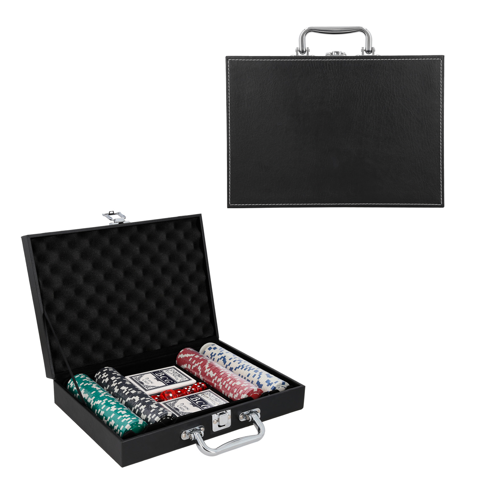 Set de juego de poker con 2 barajas, 5 dados, 1 ficha dealer y 200 fichas de 4 diferentes colores.
