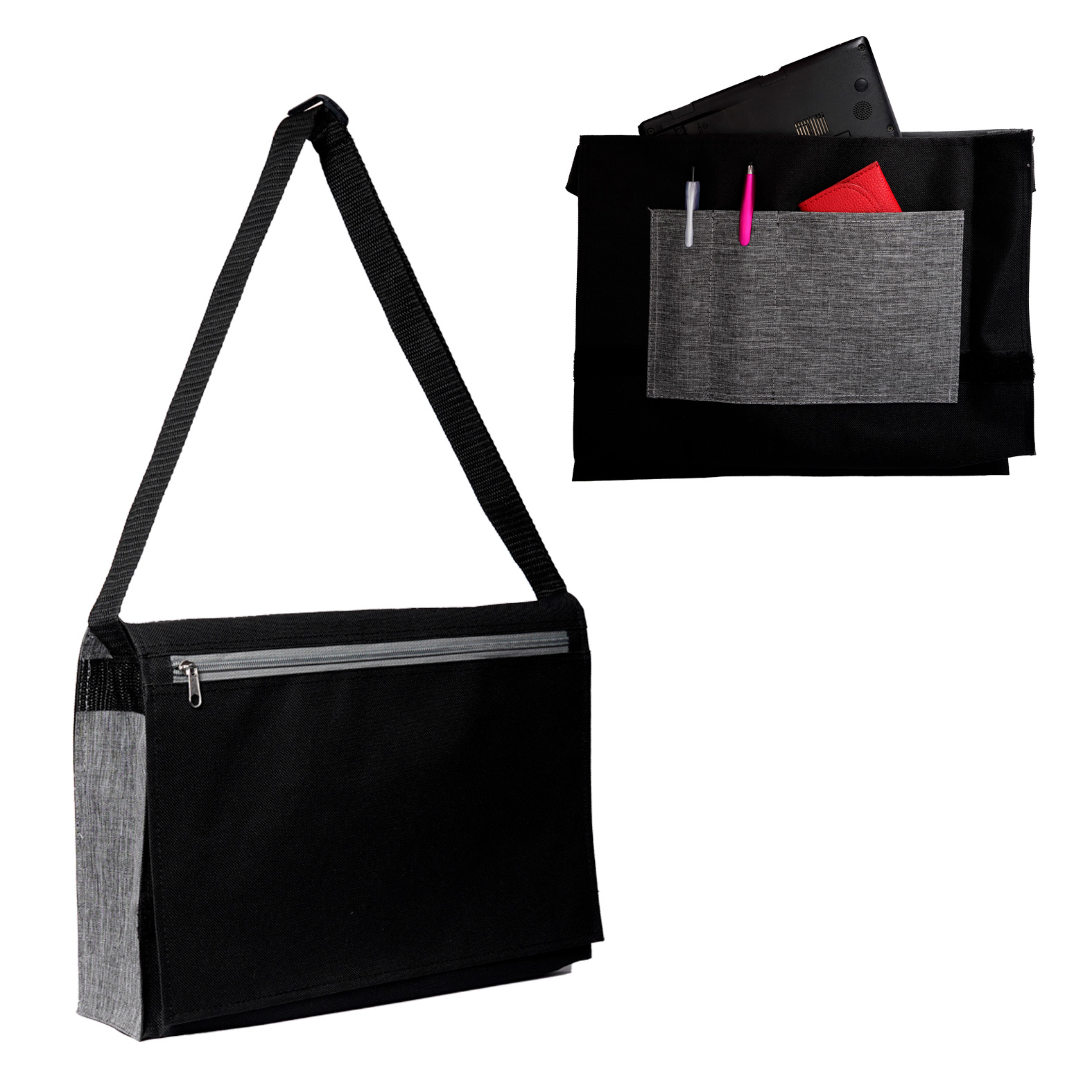 Portafolio con compartimento principal para laptop de hasta 15″, organizador frontal, solapa con cierre de velcro, bolsa trasera con cierre y correa ajustable.