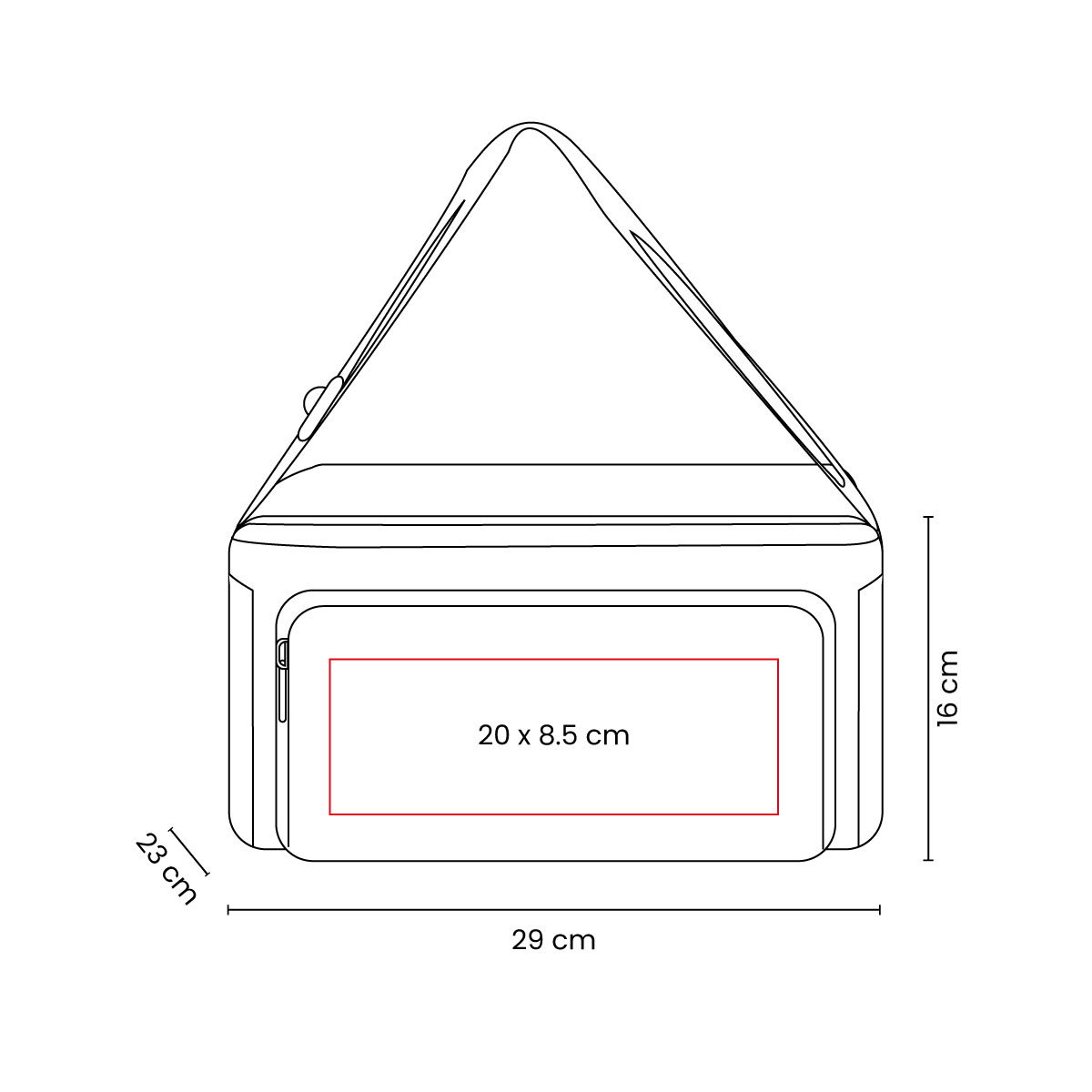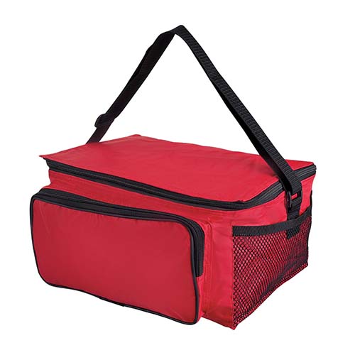 Interior metalizado plastificado e impermeable. Bolsa principal y frontal con cierre. Bolsas laterales de red. Incluye correa ajustable. Capacidad para 12 latas.