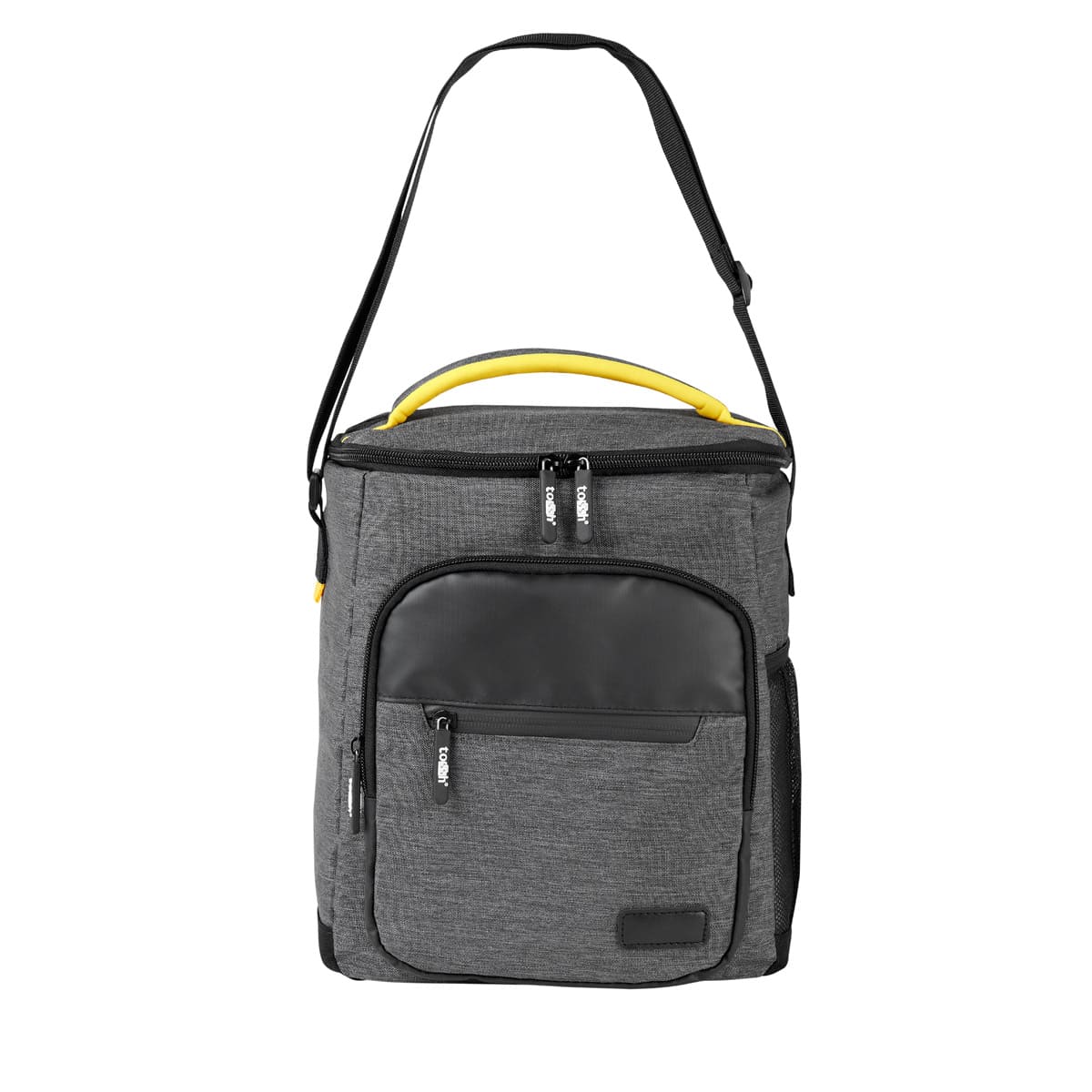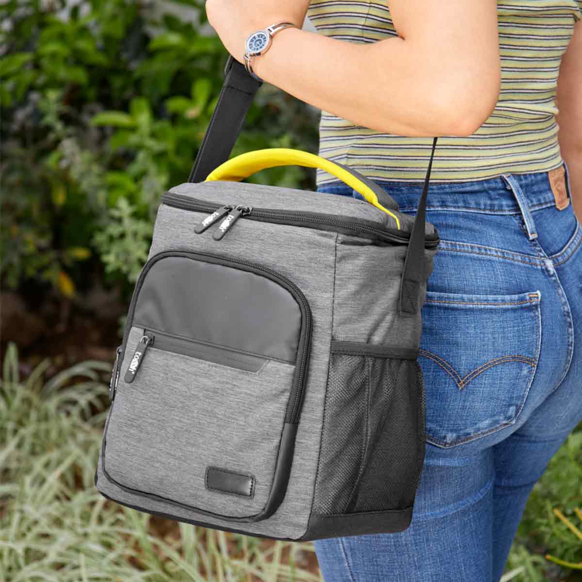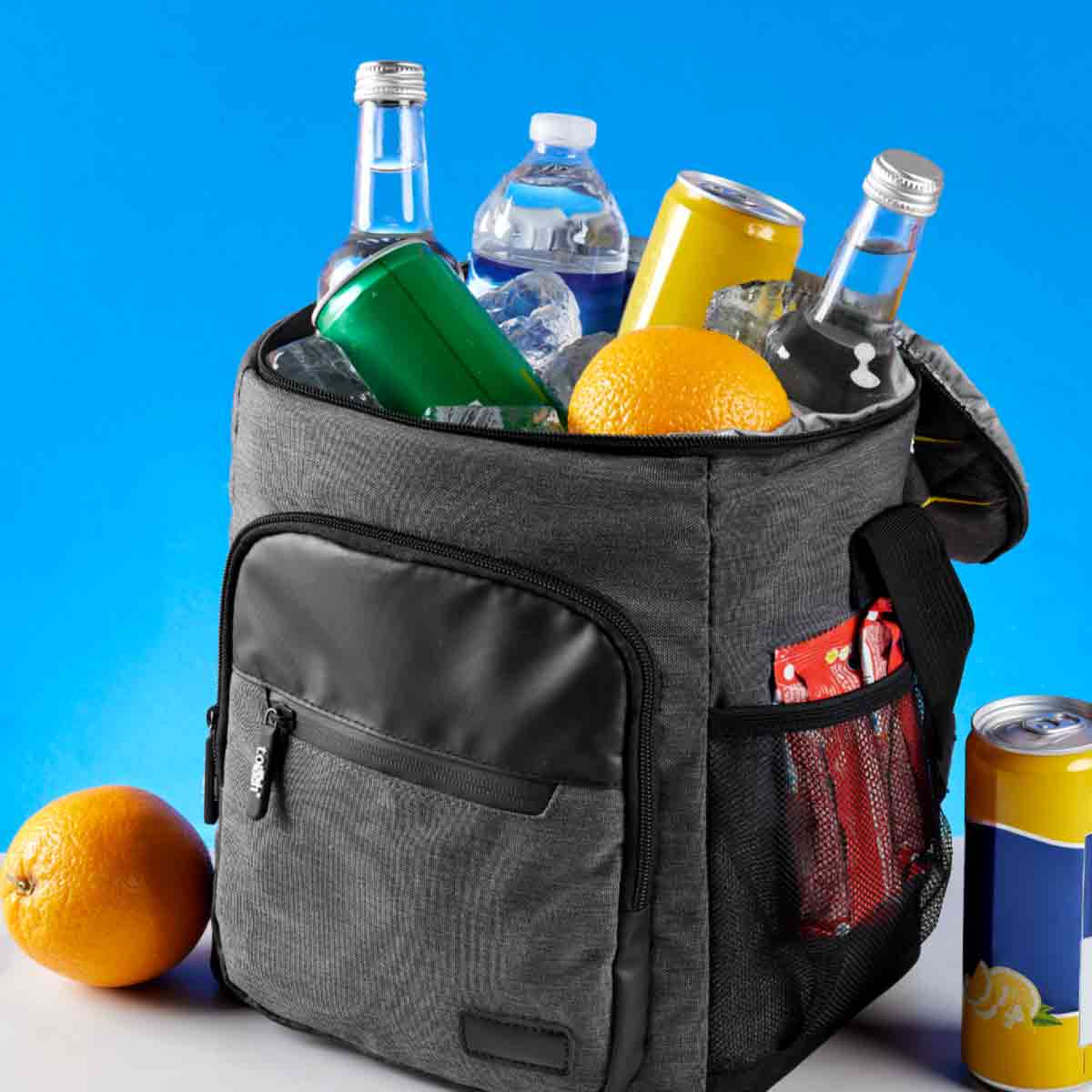 Hielera con interior plastificado impermeable. Bolsa principal superior con cierre, 2 bolsillos frontales con cierre y bolsa lateral de red. Incluye asa de mano superior acolchada y correa larga ajustable. Capacidad para 12 latas.