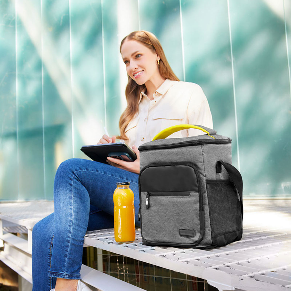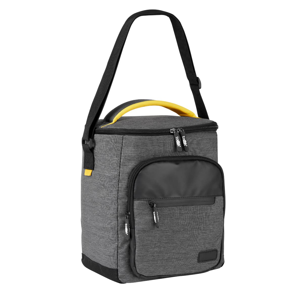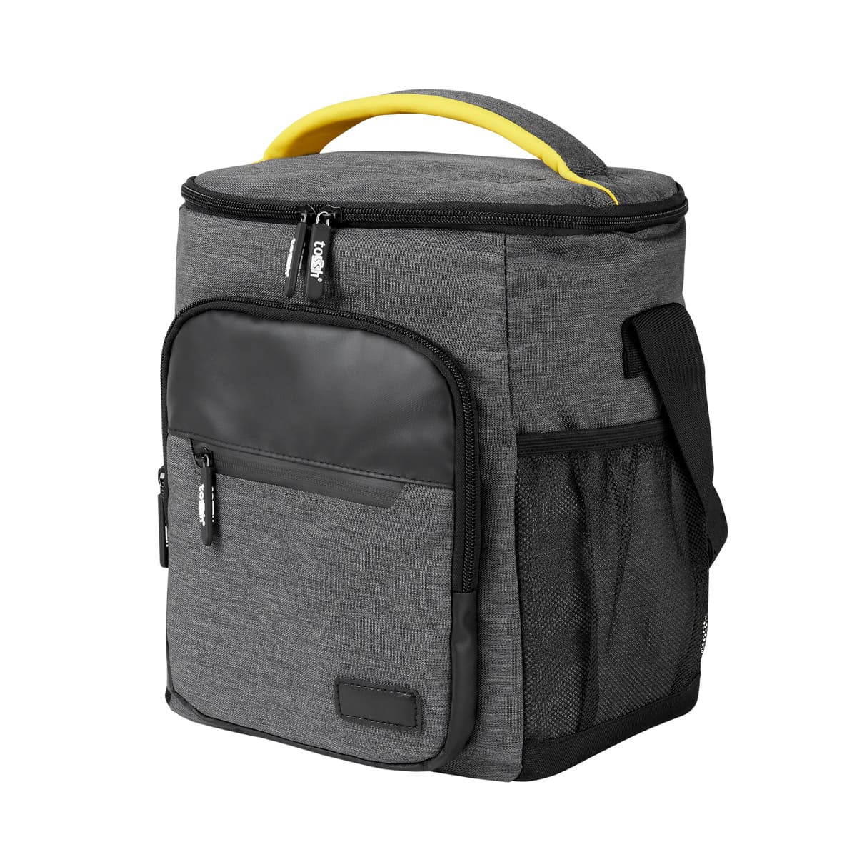 Hielera con interior plastificado impermeable. Bolsa principal superior con cierre, 2 bolsillos frontales con cierre y bolsa lateral de red. Incluye asa de mano superior acolchada y correa larga ajustable. Capacidad para 12 latas.