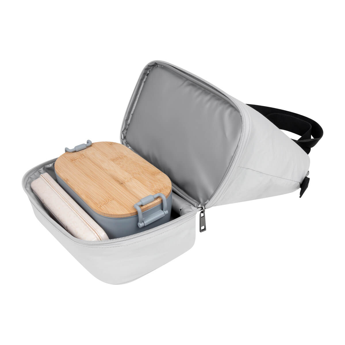 Lonchera con interior plastificado y marco interno metálico que le da mayor soporte y estabilidad. Compartimento inferior plastificado, ideal para almacenar cubiertos o alimentos compactos. Cuenta con un asa de mano de tela para transportar facilmente. Perfecta para mantener los alimentos organizados y frescos. Capacidad 6 latas.