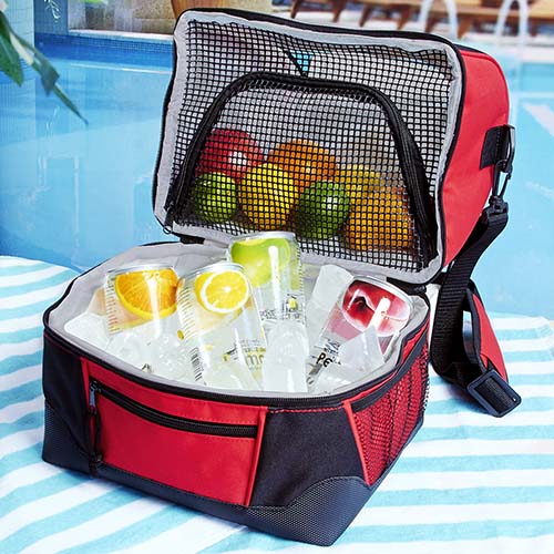 Interior plastificado impermeable. Bolsa principal, red interna para separar, bolsa frontal con cierre, bolsa lateral de red y correa ajustable. Capacidad para 12 latas.