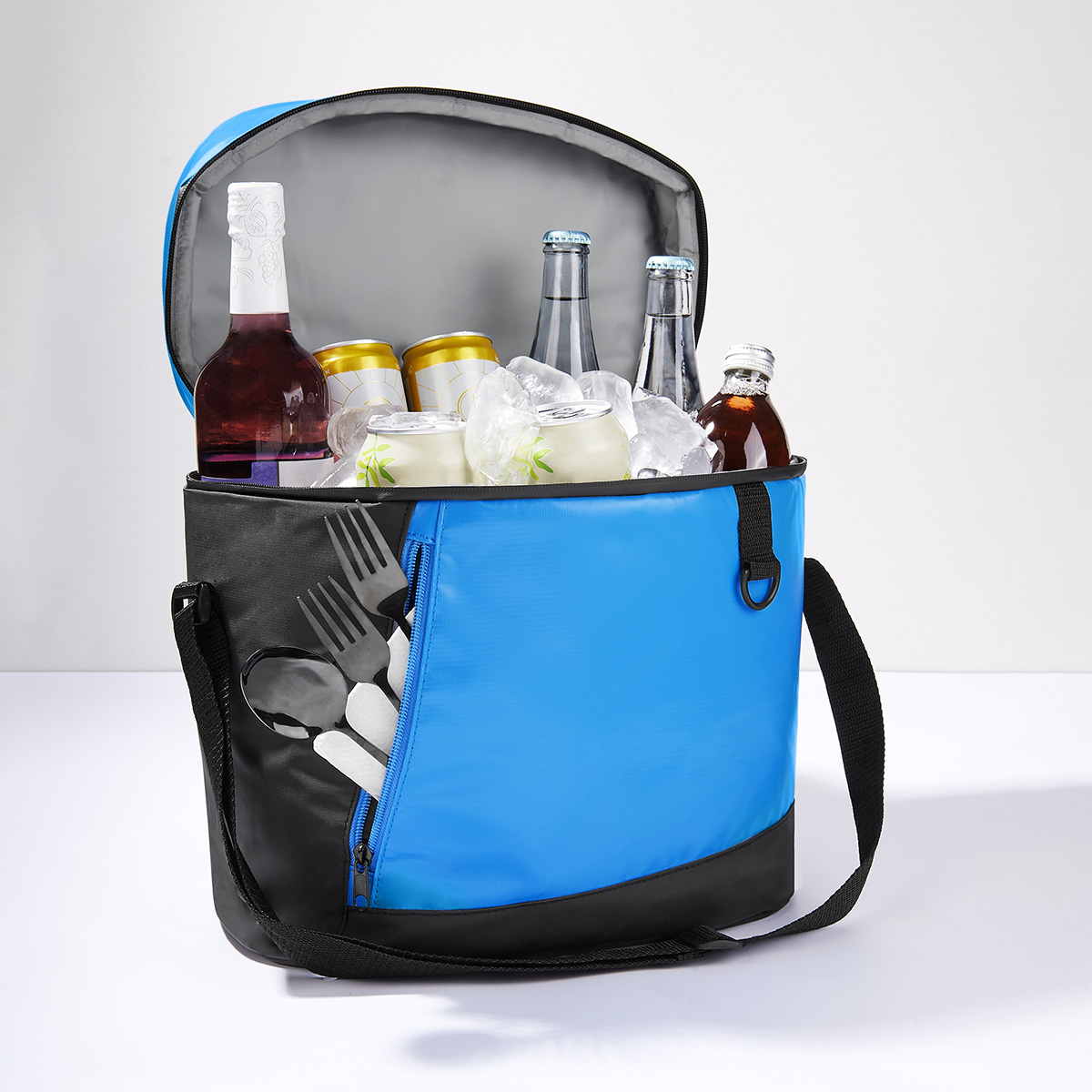 Interior y exterior plastificado impermeable. Bolsa principal y bolsillo frontal con cierre. Al frente cuenta con accesorio para colgar llaves o destapador. Incluye asa de mano y correa larga ajustable. Capacidad para 16 latas.