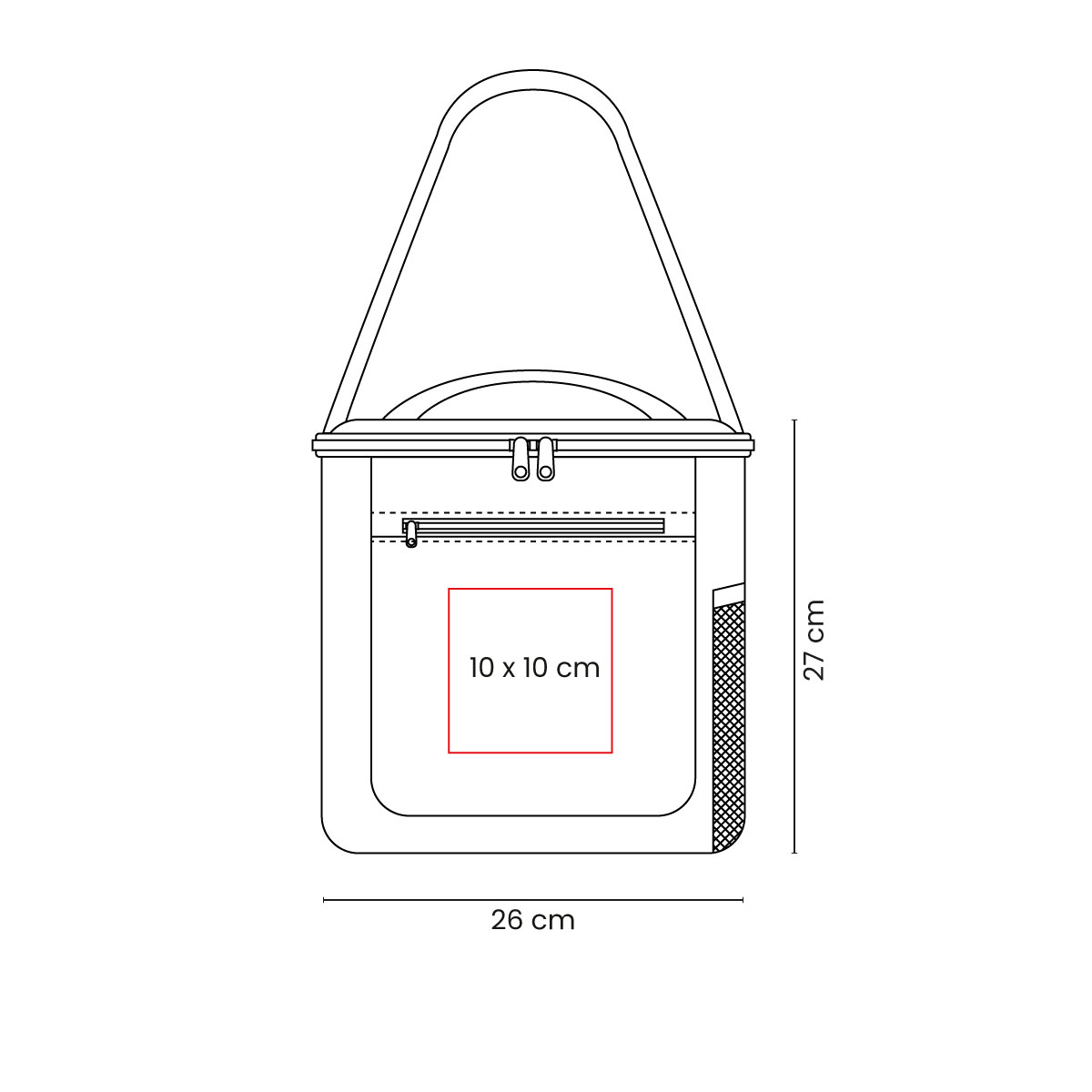 Hielera con interior plastificado impermeable. Bolsa principal y bolsa frontal con cierre. Bolsillo lateral de red. Incluye asa acolchada y correa larga ajustable. Capacidad para 24 latas.