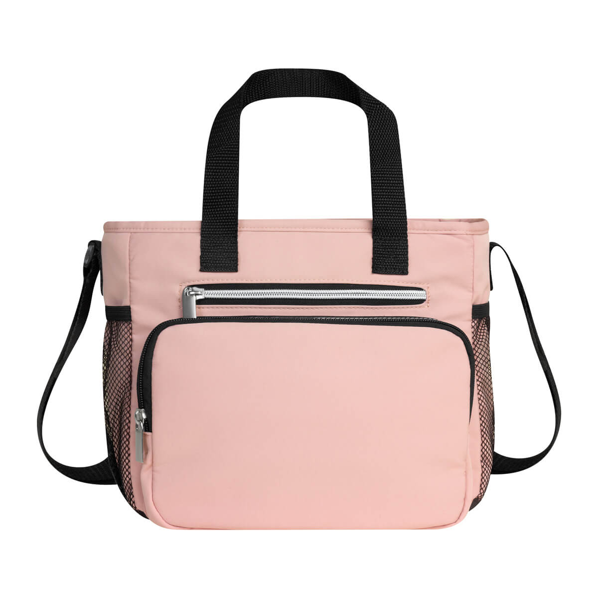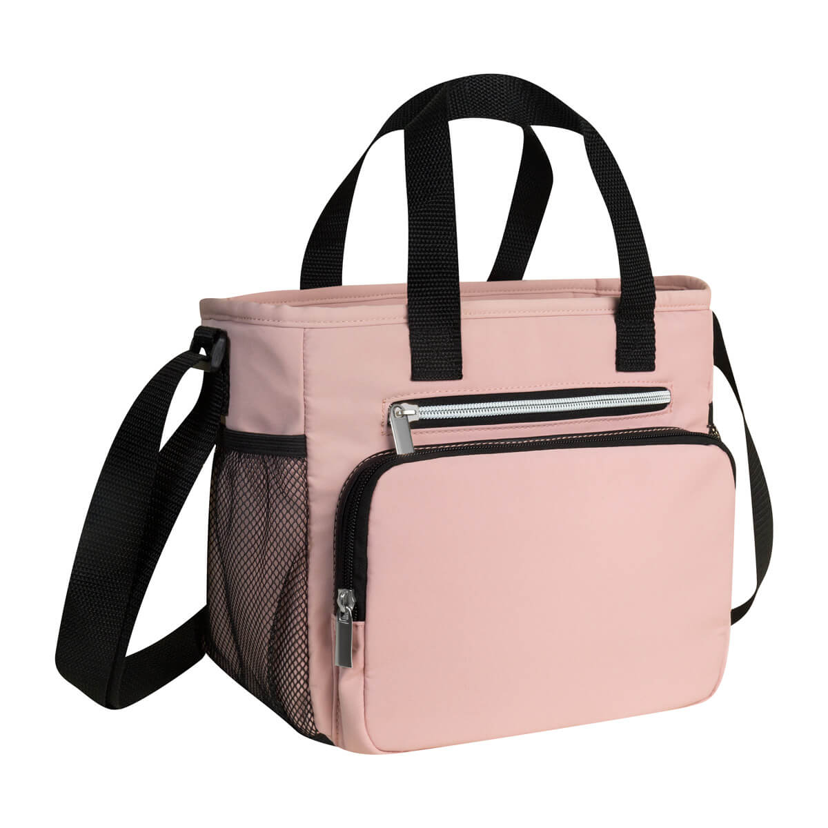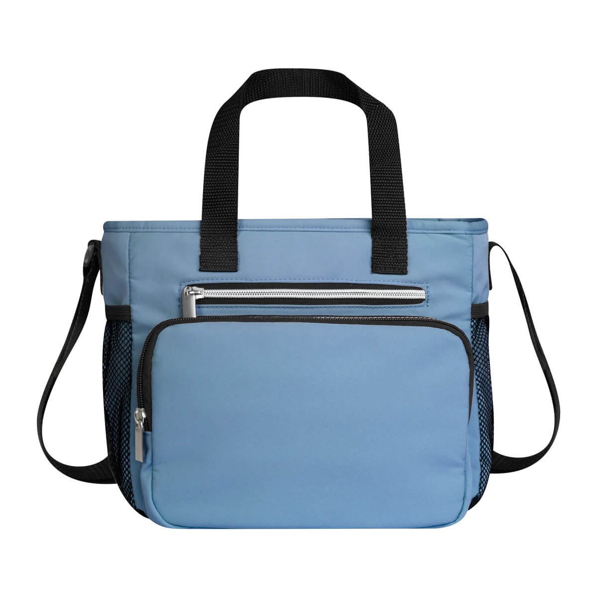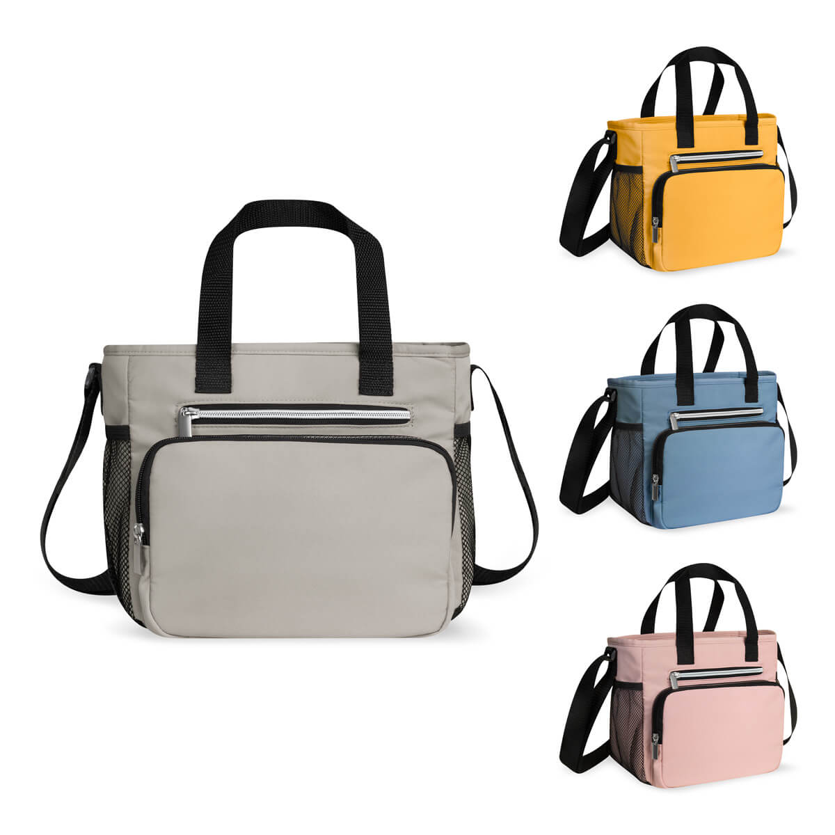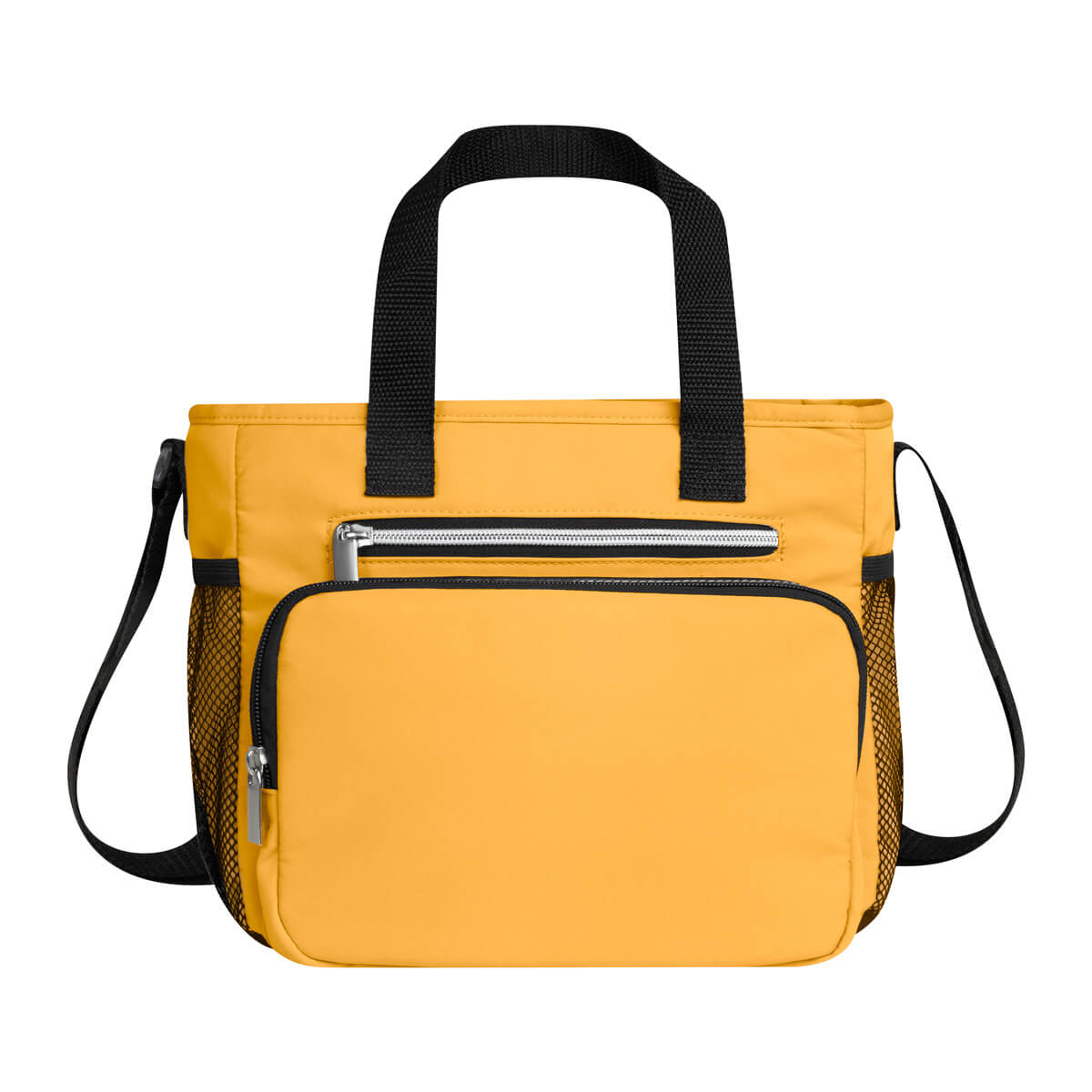 Hielera con interior plastificado impermeable. Bolsa principal con cierre, doble bolsillo frontal y dos bolsillos laterales de malla. Su práctico diseño le brinda comodidad y practicidad para almacenar alimentos y bebidas. Incluye correa para hombro ajustable. Capacidad de 10 latas.