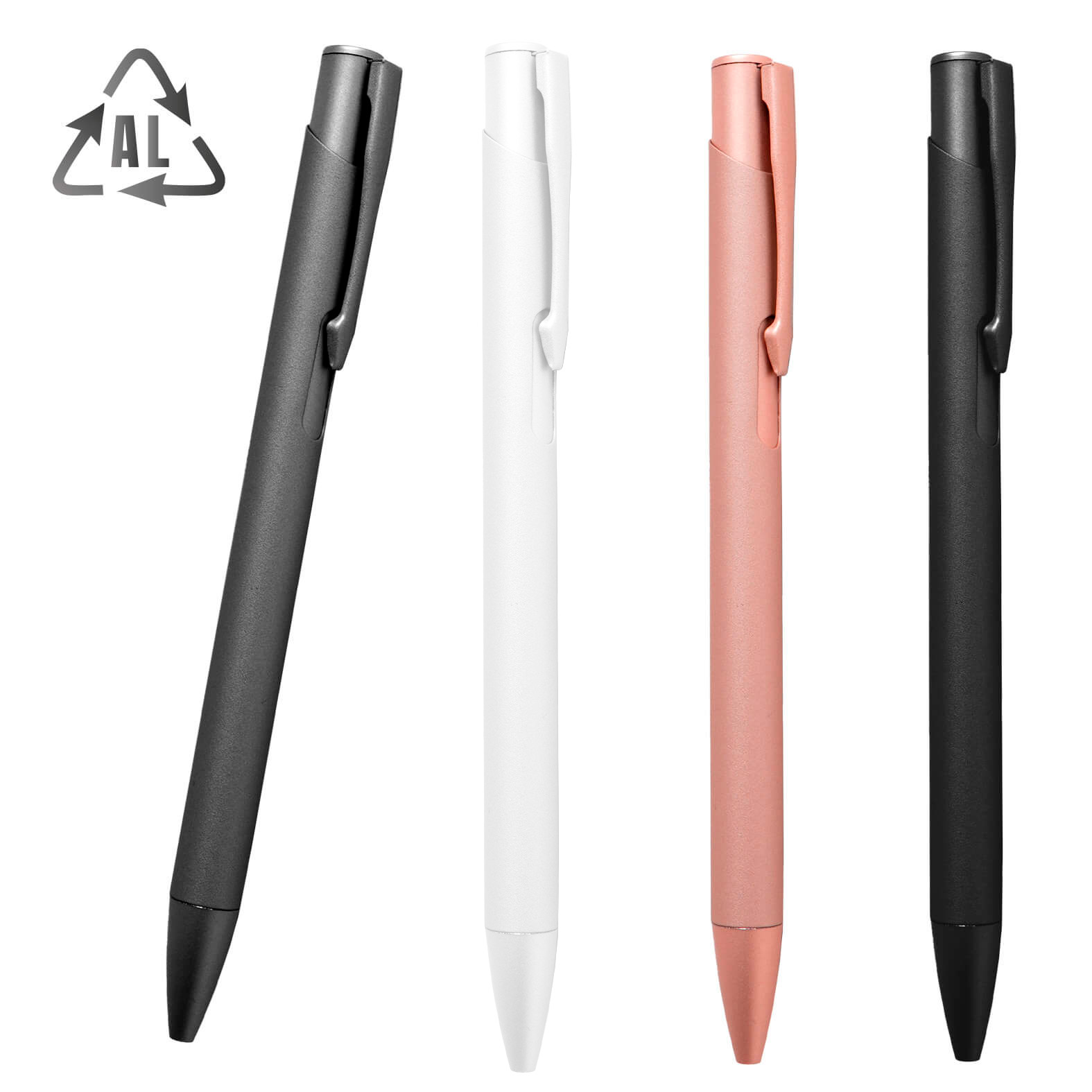 Bolígrafo ecológico fabricado con aluminio reciclado. Cuenta con mecanismo de click y un clip integrado para mayor practicidad.