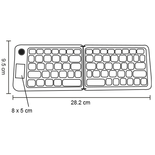 Teclado inalámbrico plegable con botón de conexión. Incluye soporte y cable de carga.
