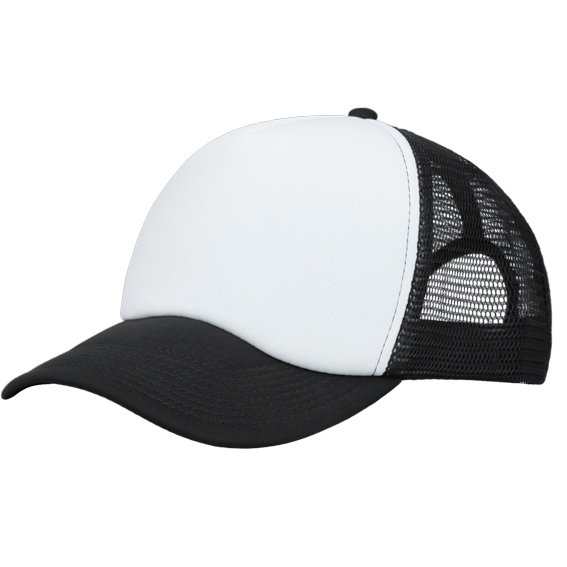 Gorra 100% poliéster con broche de plástico, visera acolchada en la parte superior que cuenta con 1 gajo frontal en color blanco y 4 gajos con malla.