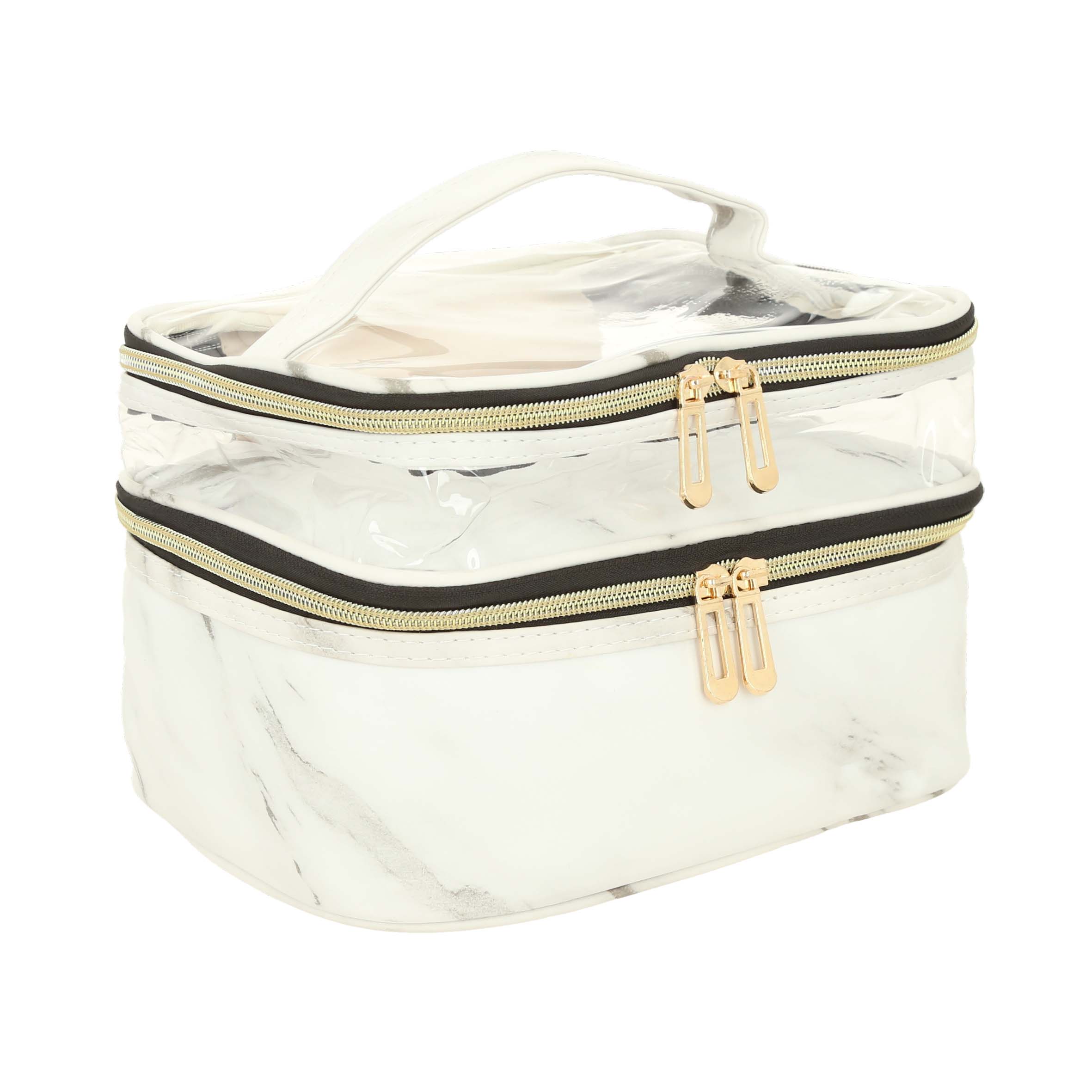 Cosmetiquera con apariencia de mármol, doble nivel, uno color sólido, uno transparente con asa en la parte superior y fuelle de 17 cm.