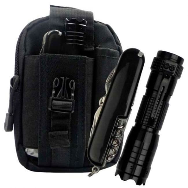 • Incluye bolsa ajustable al cinto con compartimentos, navaja multifuncional y linterna.