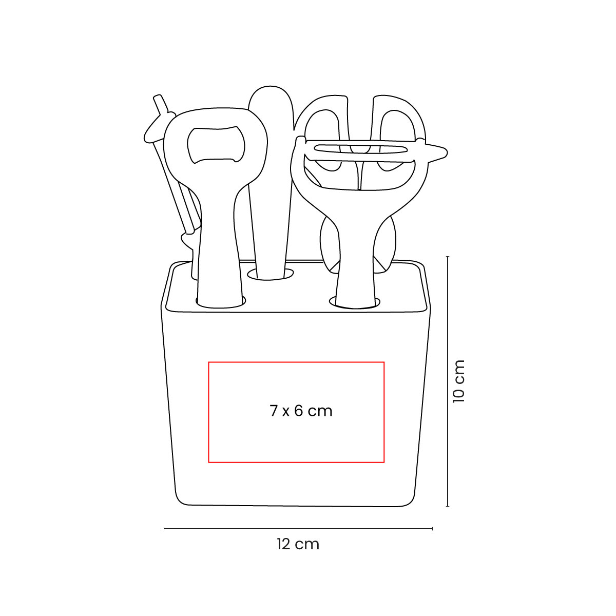 Juego de cocina con base y 5 accesorios: 1 cuchillo para frutas, 2 ralladores / peladores, 1 destapador de botellas y 1 tijeras con rompenueces. Cada utensilio cuenta con un mango ergonómico. Base de almacenamiento con escurridor, ideal para permitir el secado de los accesorios después de lavarlos. Incluye caja individual.