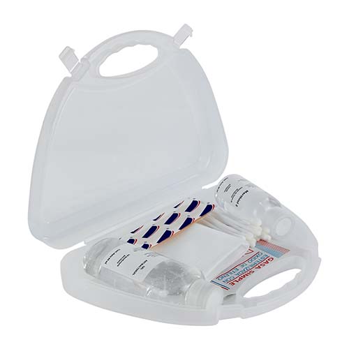 Incluye gel sanitizante de 60 ml, 1 cubre boca, 2 gasas, 3 curitas, 20 cotonetes, 1 mertodol de 40 ml y estuche de plástico. Este producto por ser últimas piezas puede presentar alguna variación, no se aceptan devoluciones.