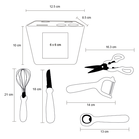 Kit para cocina que incluye cuchillo, batidor, tijeras, destapador, pelador y una base para soporte.