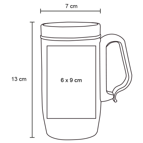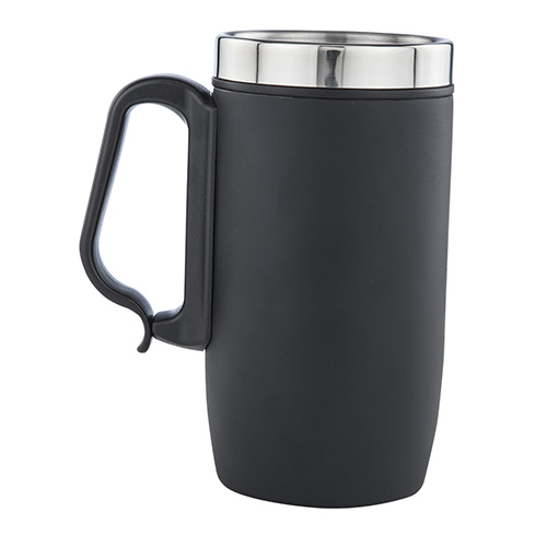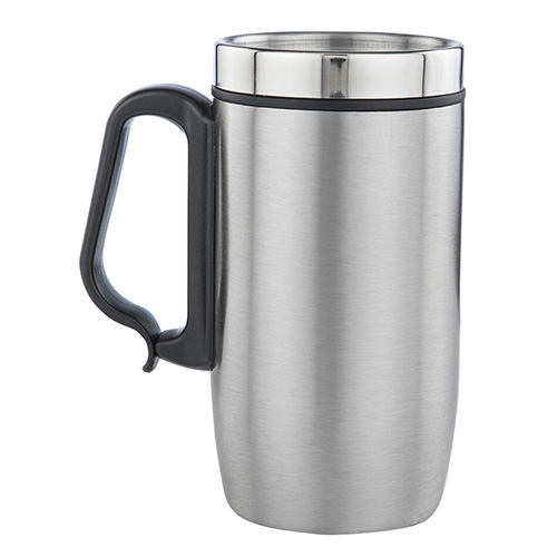 Taza térmica con doble pared de acero inoxidable y asa de plástico.
