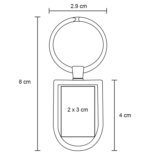 Llavero metálico rectangular con la parte inferior redondeada y aro reforzado.