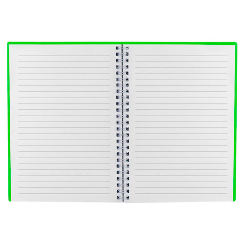 Libreta con 80 hojas de raya. Incluye notas adheribles de colores, espiral metálico doble y elástico para cerrar.