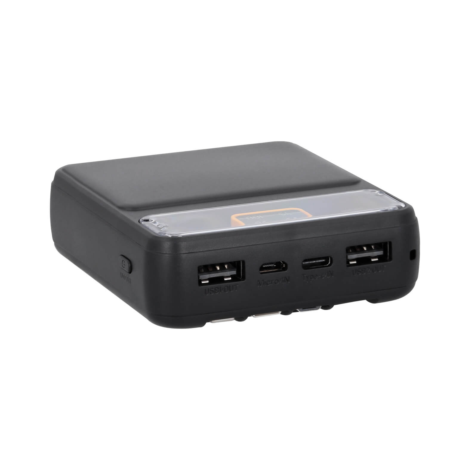 Power Bank de 8,000 mAh con carga rápida, cables para dispositivos de entrada USB, micro USB, tipo C y lightning, además de 2 puertos USB, 1 Micro y 1 tipo C. Incluye indicador de carga y botón de encendido o apagado.