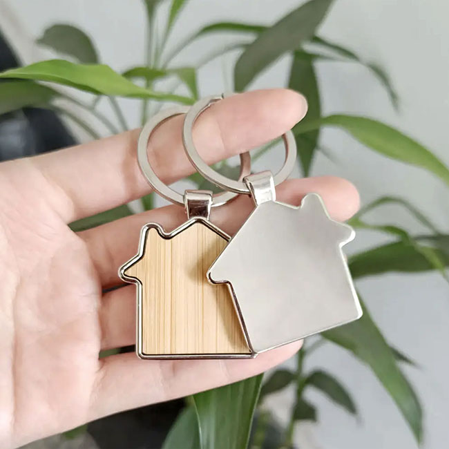 • Llavero metalico con aplicacion de lamina de bamboo, con forma de casa.