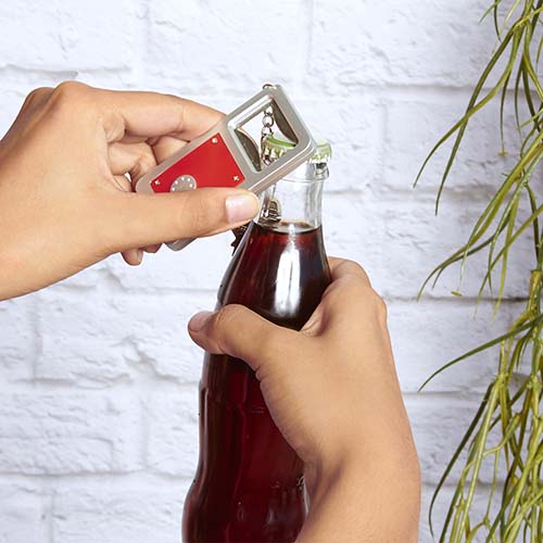 Llavero destapador con lámpara de 1 LED. Incluye 2 baterías de botón.