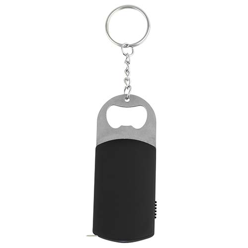 Llavero destapador con lámpara de 1 LED y flexómetro de cinta metálica de 1 m.