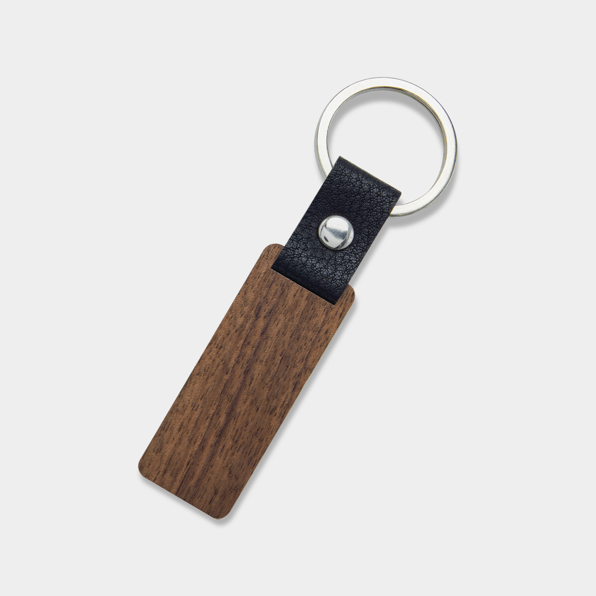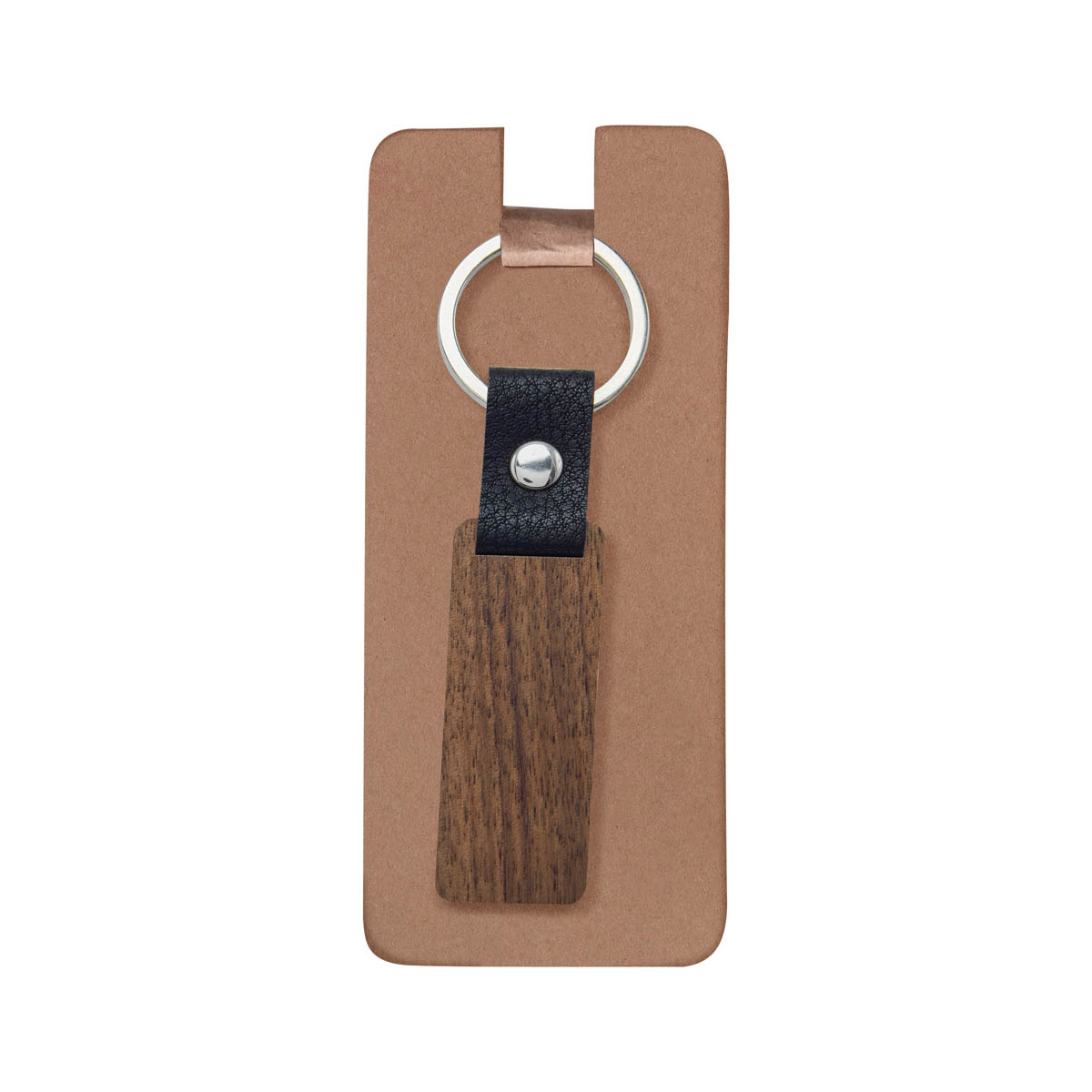 Llavero de madera con tira de curpiel. Incluye empaque con exhibidor de cartón y bolsa individual.
