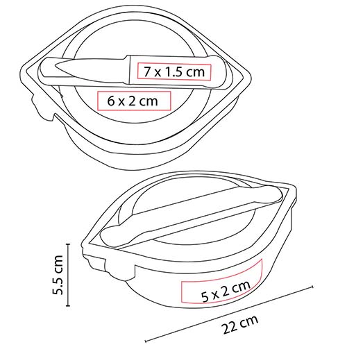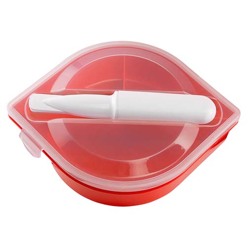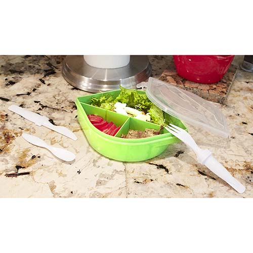 Lonchera con 3 compartimentos en el interior. Incluye portacubiertos con cuchara, tenedor y cuchillo. Tapadera con pestañas para un mejor cerrado. No recomendado para microondas.