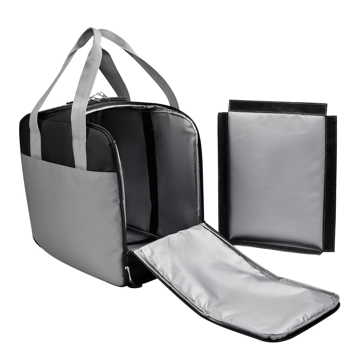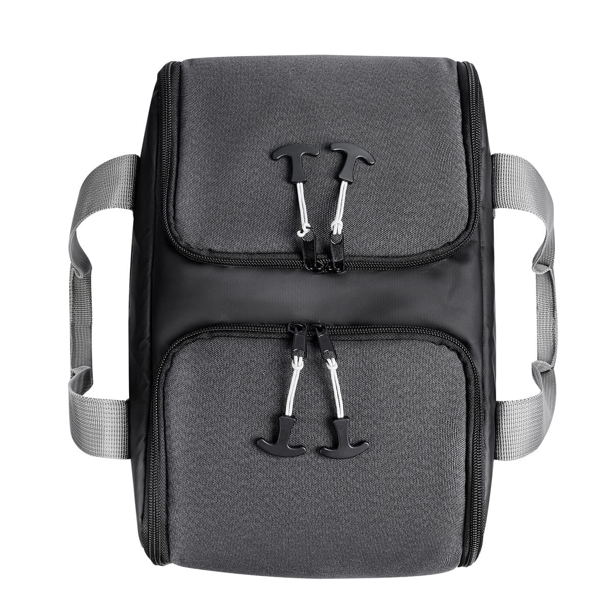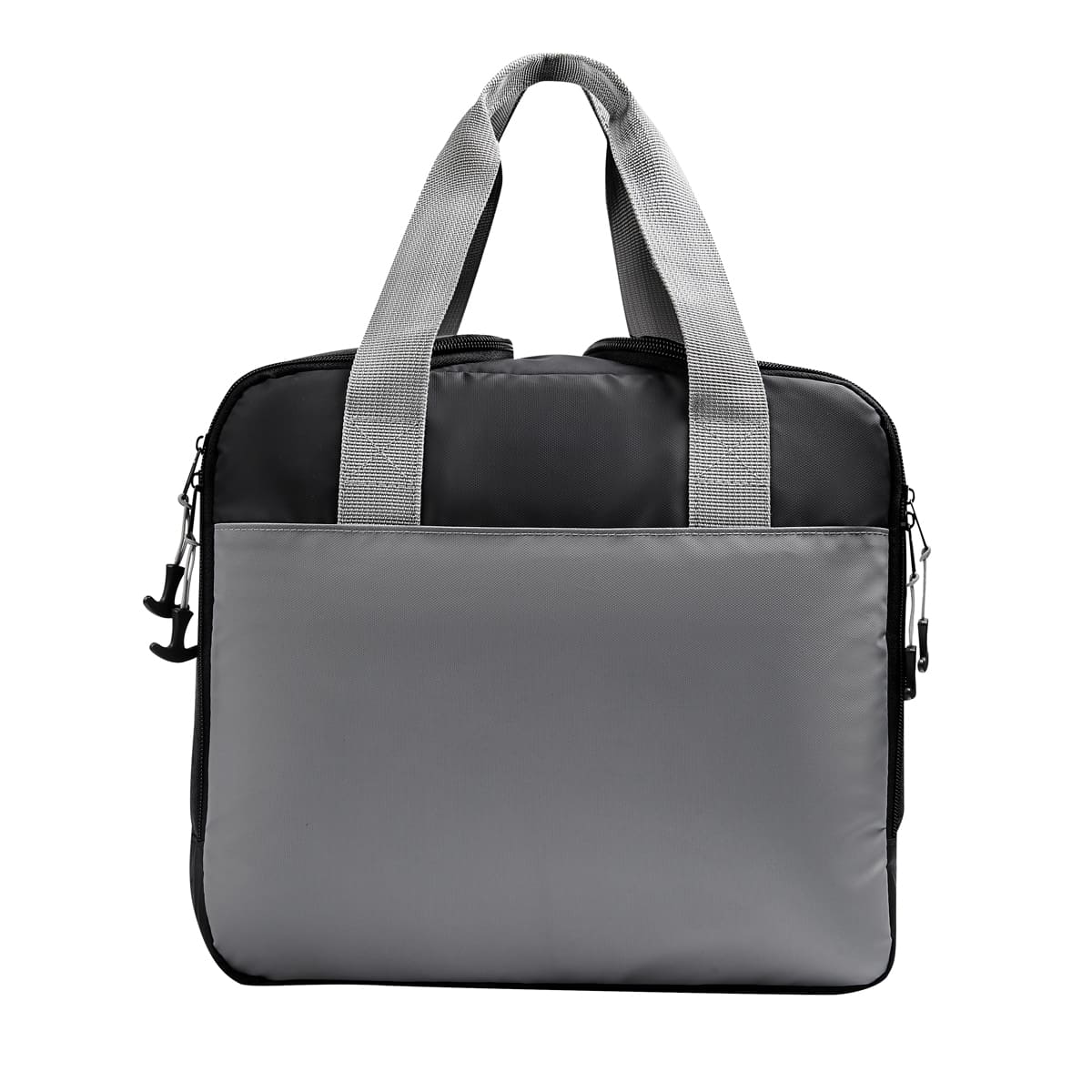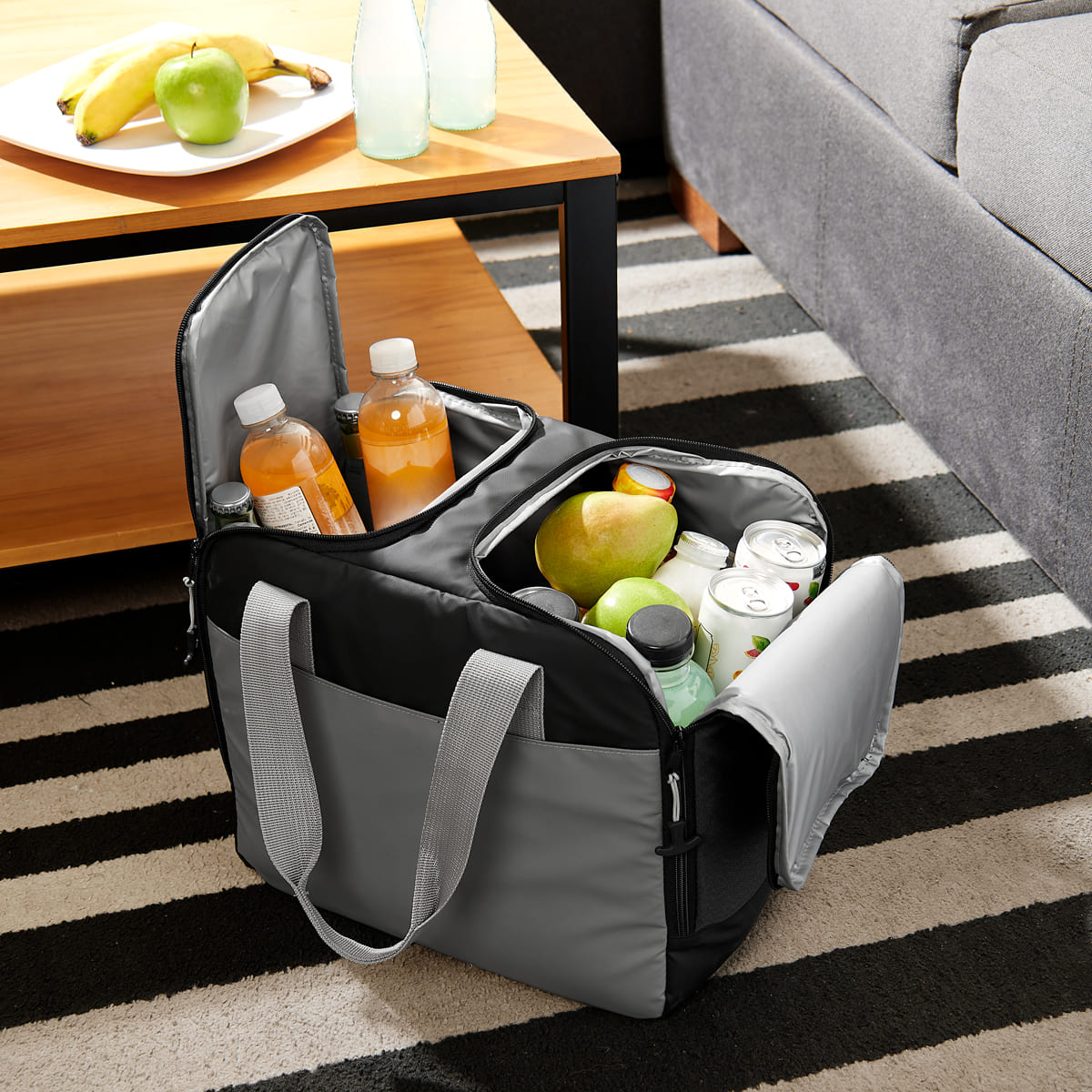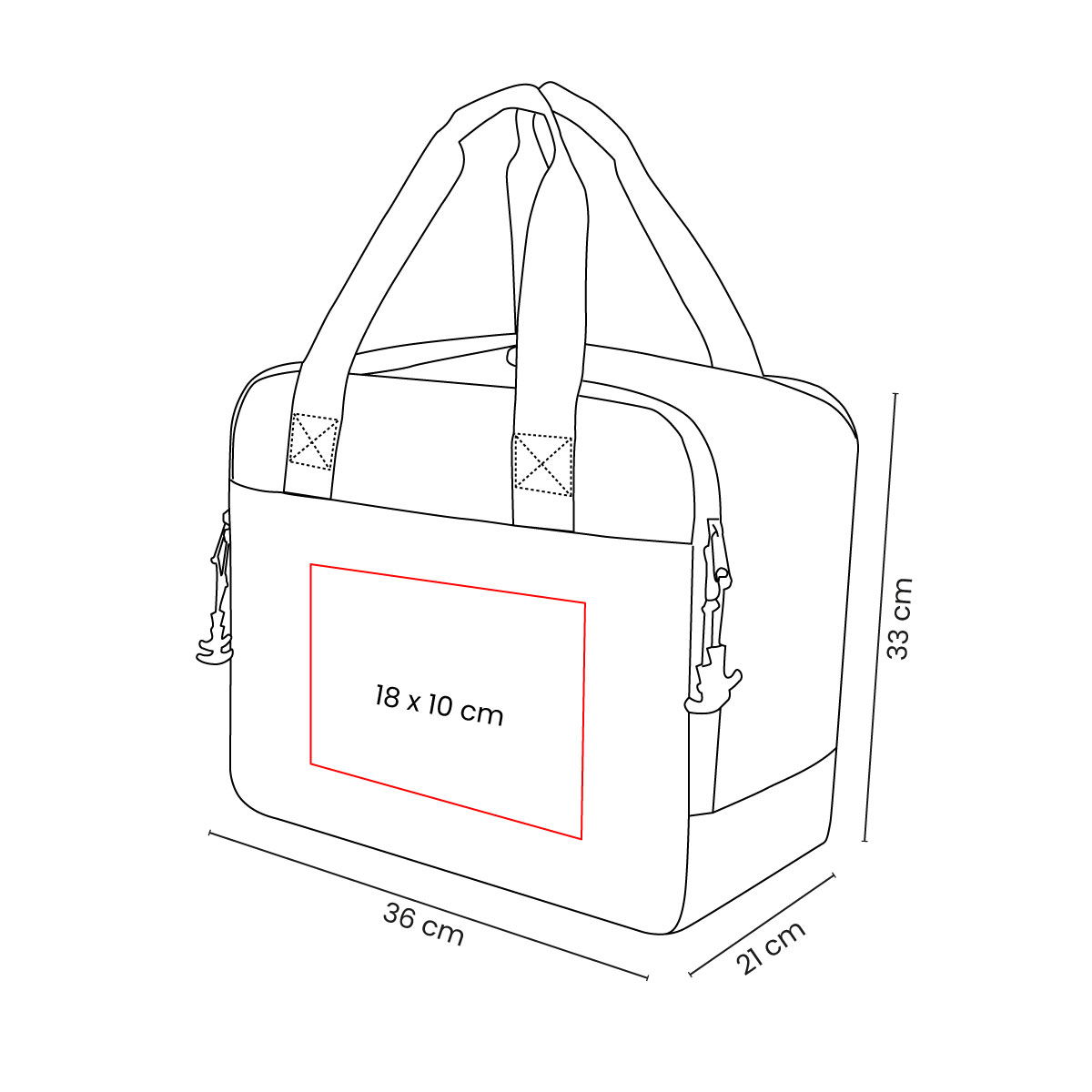 Lonchera con interior plastificado. Su compartimento principal incluye dos cierres independientes y un separador interno que permite utilizar cada espacio por separado. Incluye broches de velcro que permite retirarlo fácilmente y obtener así mayor espacio. Bolsa frontal con cierre de velcro y asas de mano.