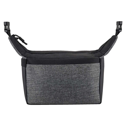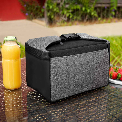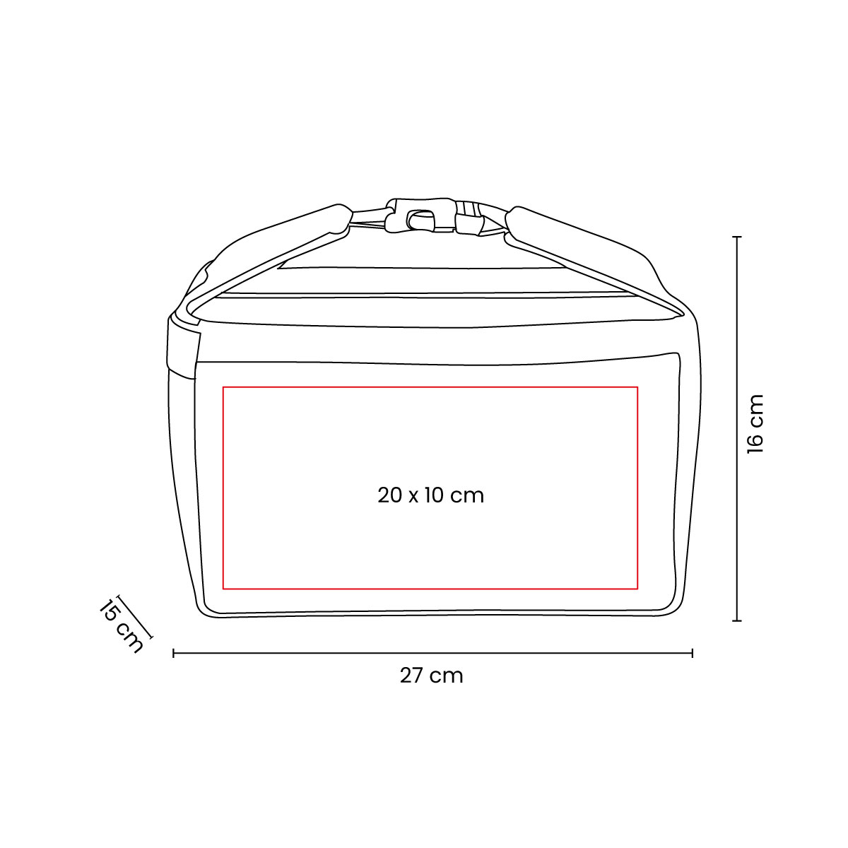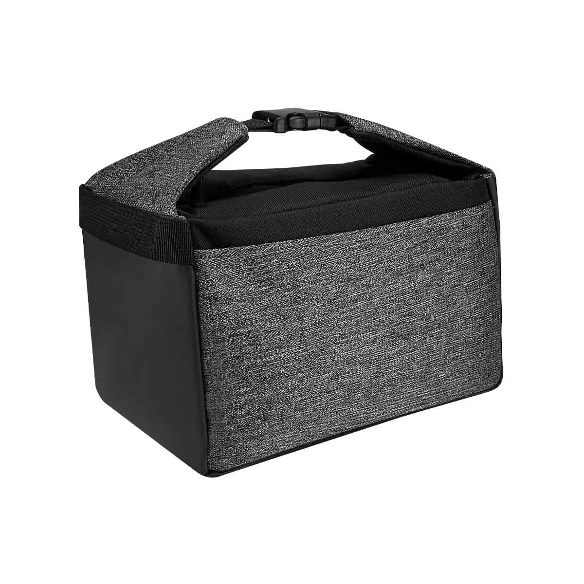 Interior plastificado. Bolsa principal con cierre y agarradera con broche de plástico. Capacidad para 8 latas.