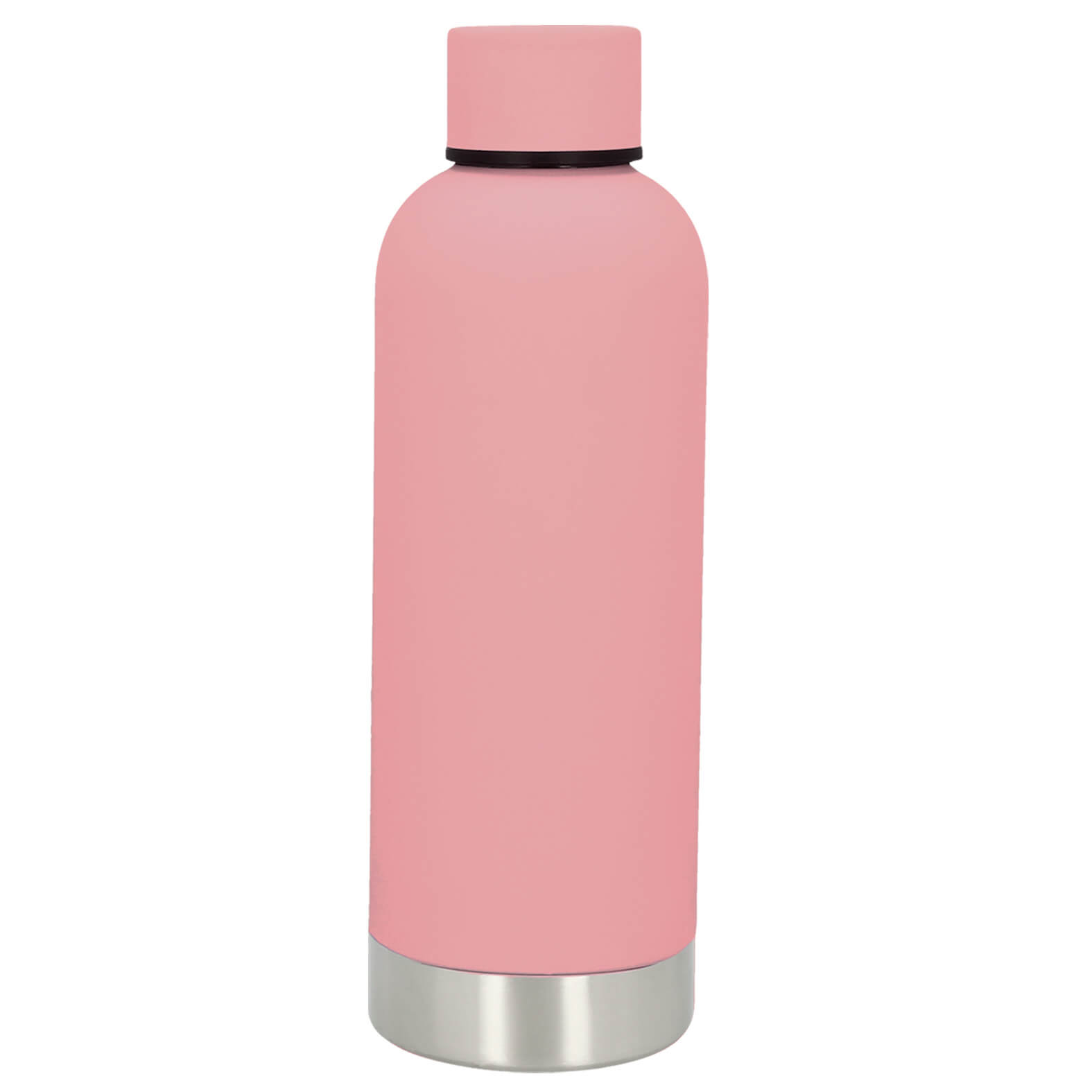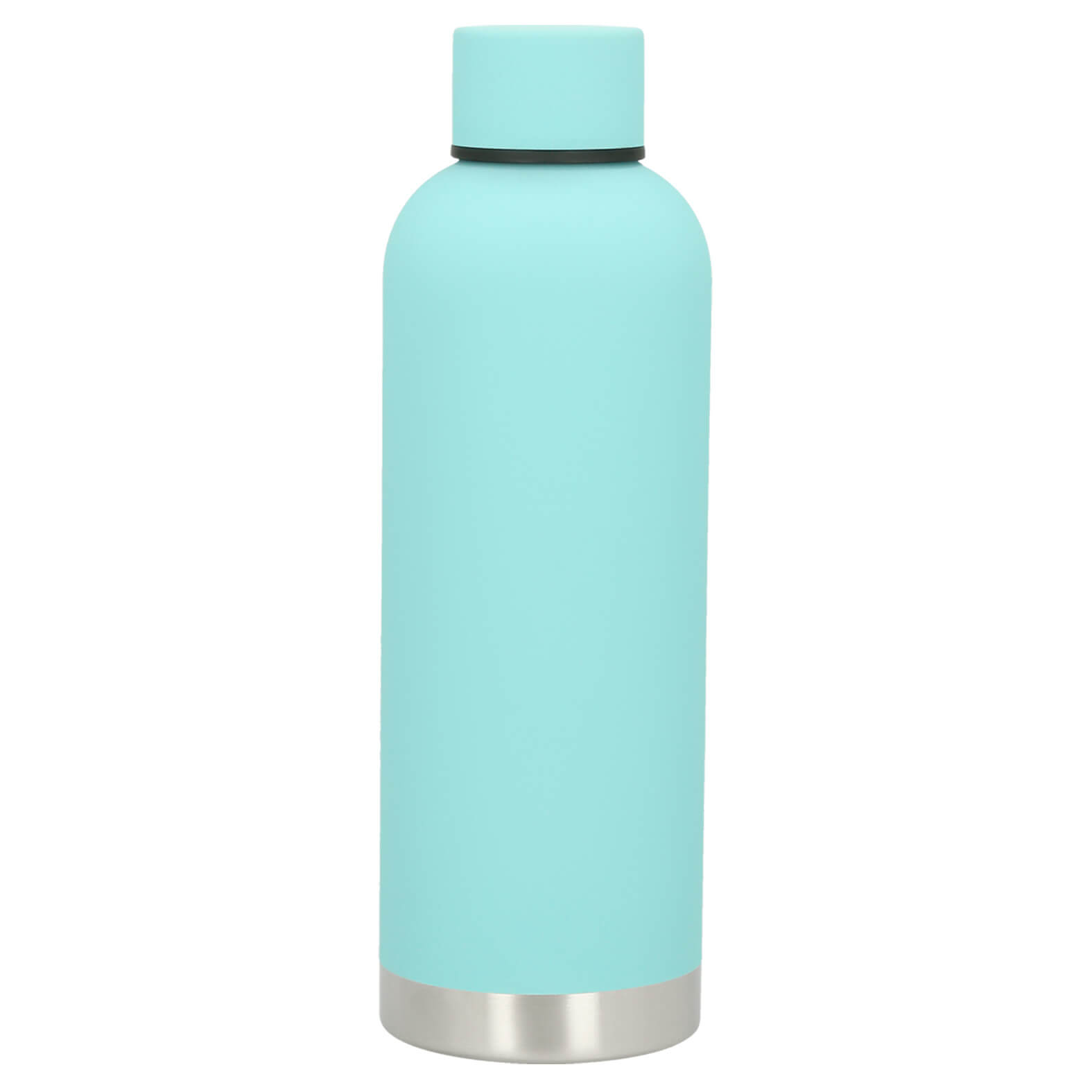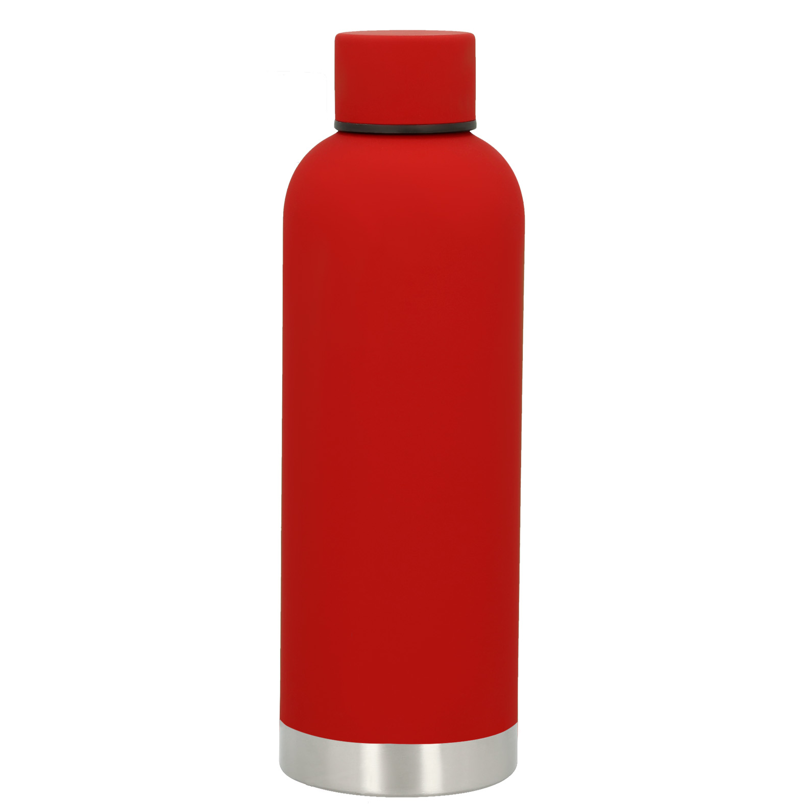 Termo de acero inoxidable de doble pared insulado al vacío con acabado rubber y tapa enroscable.