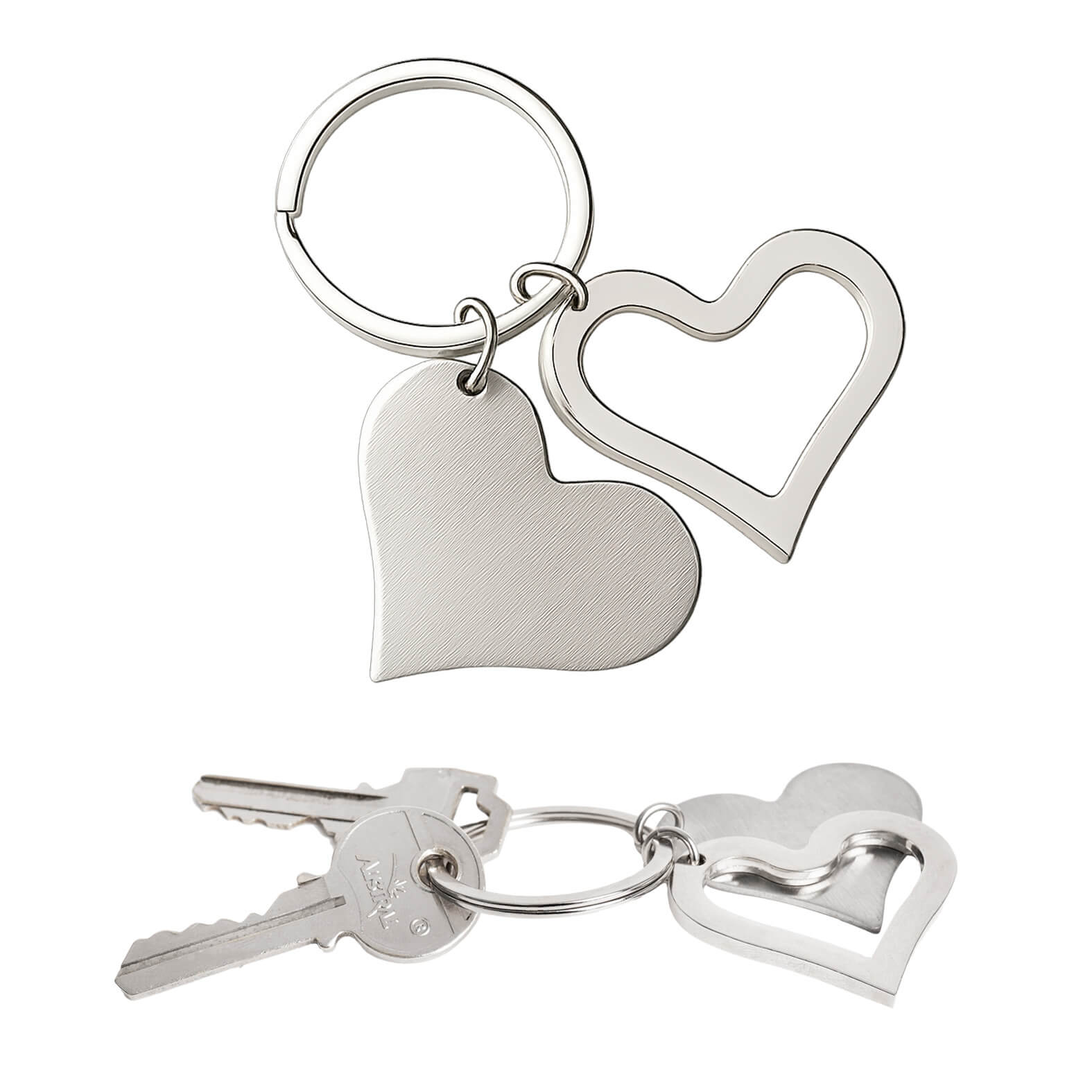 Llavero metálico doble en forma de corazón, placa sólida y silueta, con arillo reforzado para colgar.