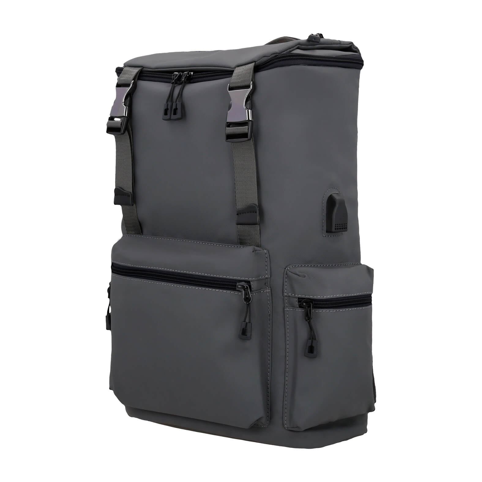 Mochila de 1 compartimento principal con espacio para porta laptop, 1 bolsa interna, 1 bolsa frontal, dos bolsas laterales con cierre, 1 bolsa en parte superior, broches, carry on y asa superior.