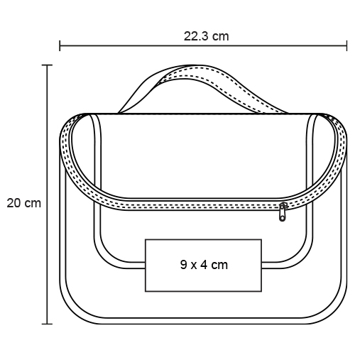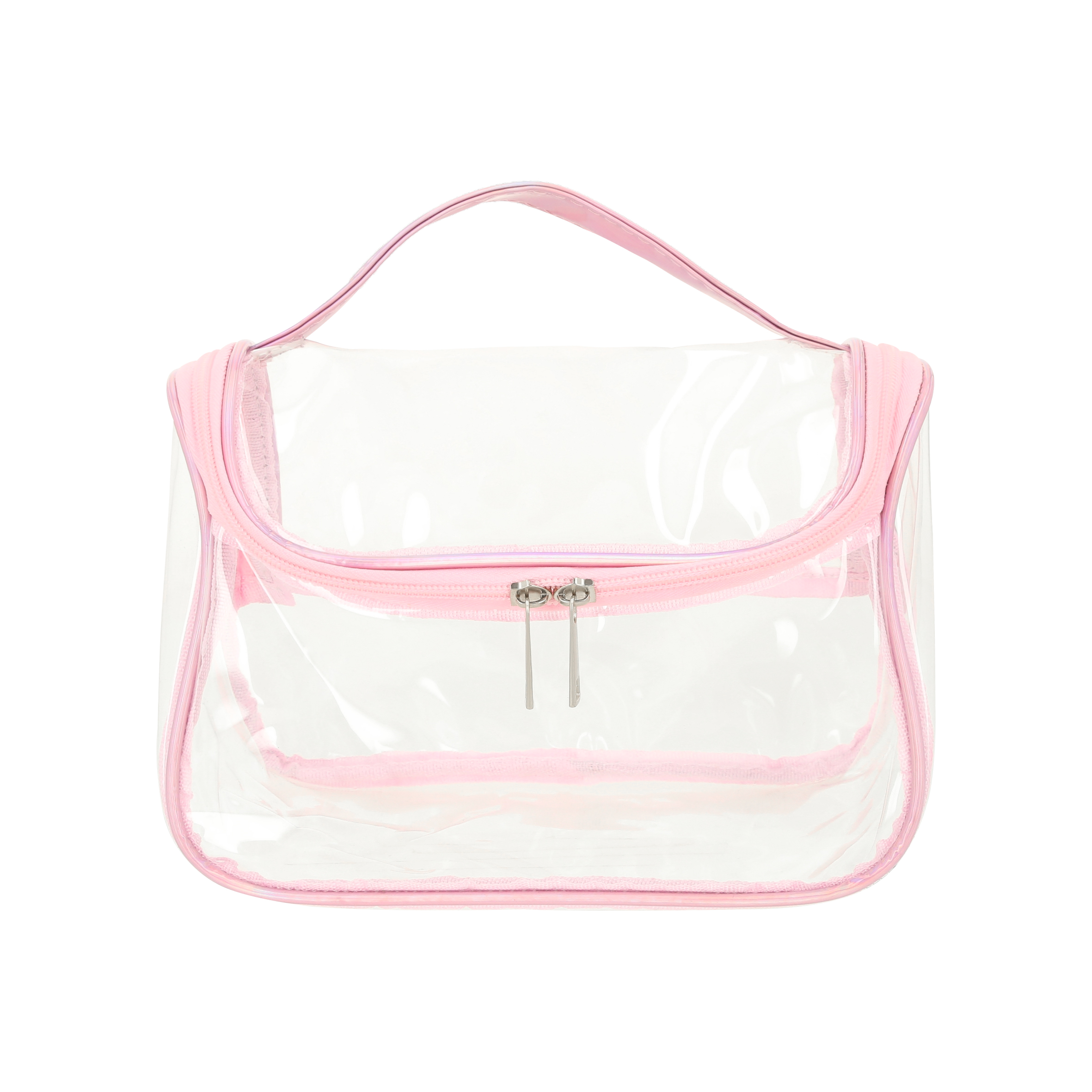 Cosmetiquera de plástico transparente, costuras en color rosa, doble cierre y asa.