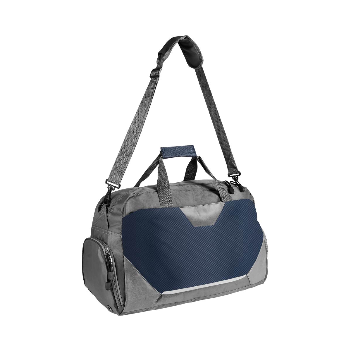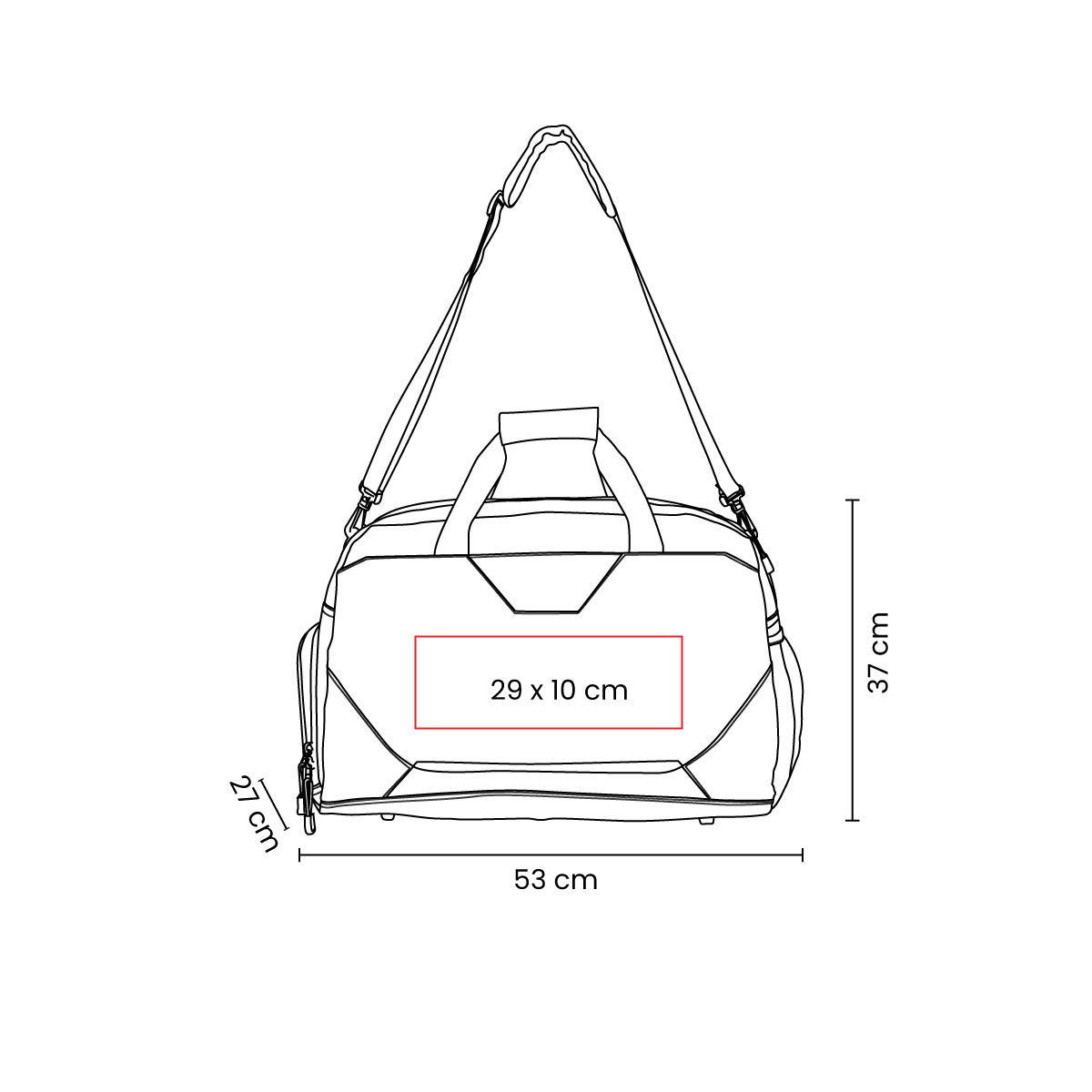 Bolsa principal con cierre, bolsa frontal. Compartimento lateral para zapatos y bolsa lateral. Incluye correa para hombro ajustable con broches de plástico y asas superiores.