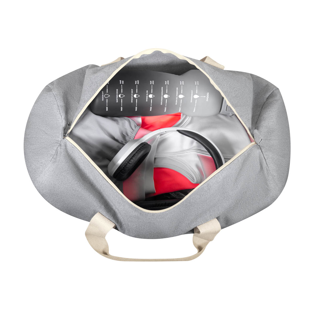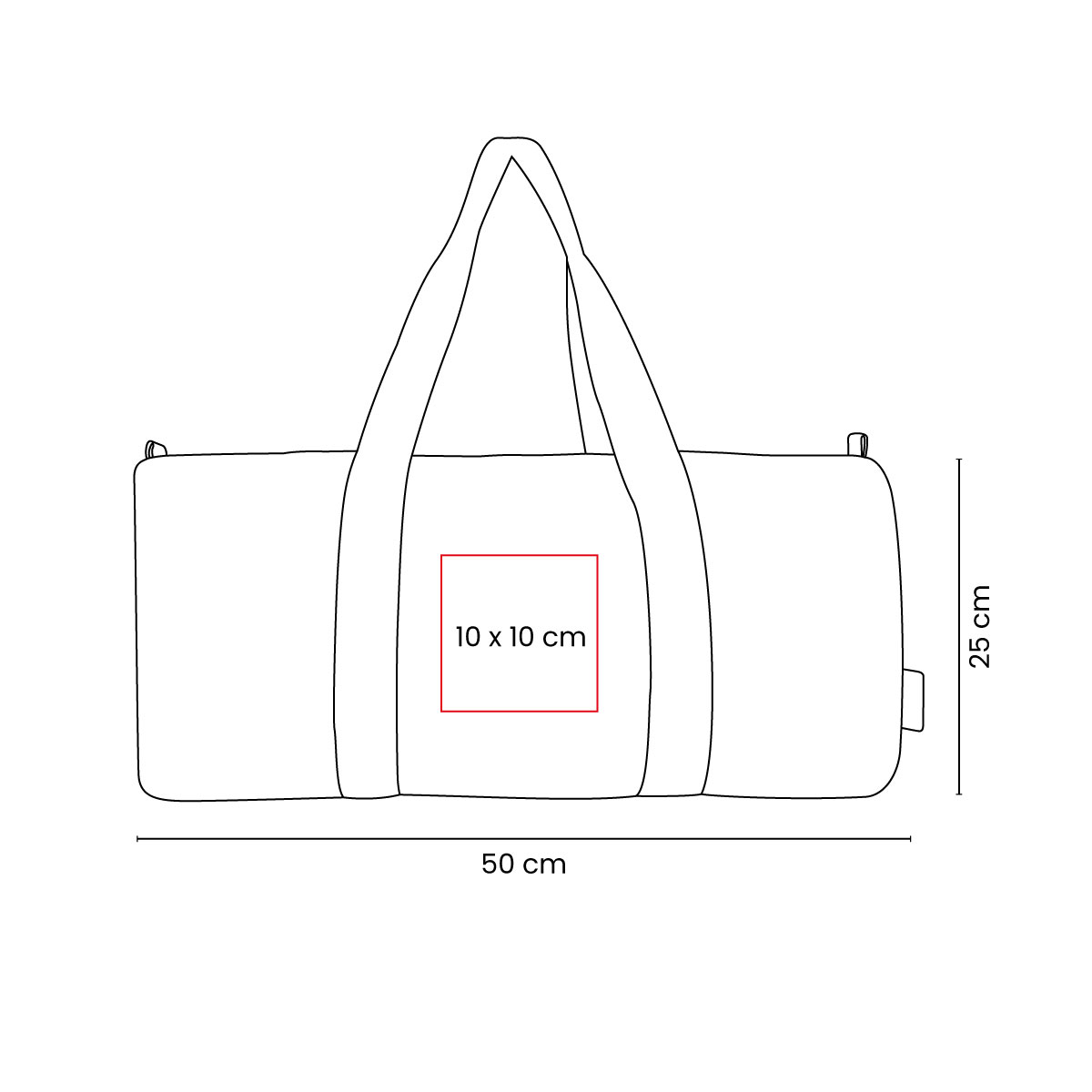 Maleta ecológica fabricada con algodón reciclado. Cuenta con un compartimento principal con cierre y dos asas para hombro.