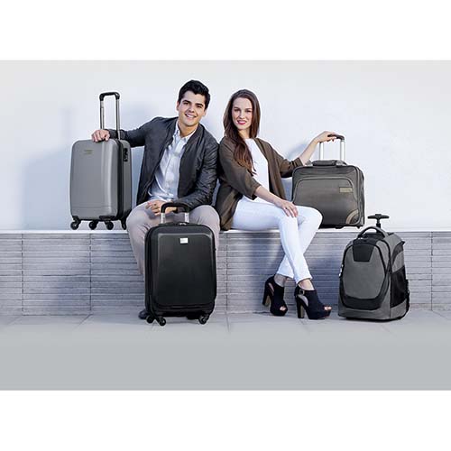Maleta trolley con 4 ruedas. Cierre frontal con espacio para laptop y organizador de documentos. Cierre principal con 2 compartimentos internos. Placa metálica removible para fácil grabado y candado de seguridad con combinación de 3 dígitos. Asa de agarre superior.