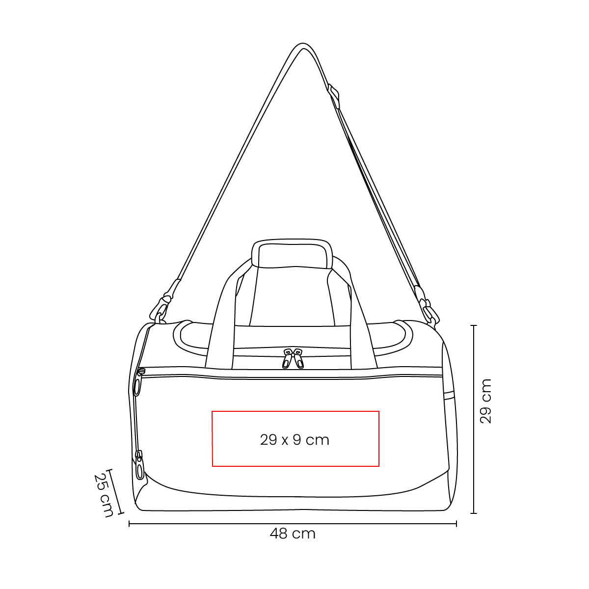 Práctica maleta con amplio compartimento principal y un bolsillo frontal con cierre. Cuenta con un compartimento lateral para calzado y un bolsillo lateral de malla para objetos pequeños. Incluye correa ajustable para hombro con broches de plástico removibles y asas de agarre superior. Perfecta para uso deportivo o viajes cortos