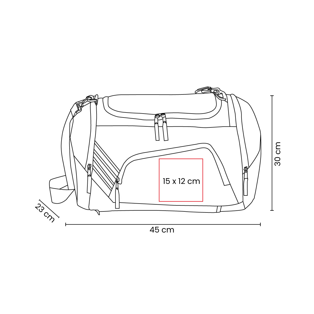 Maleta-mochila con bolsa principal, bolsa frontal con cierre, tiras reflejantes, bolsa lateral con cierre y zapatera. Incluye tirantes acojinados, correa ajustable y compartimento trasero para esconder tirantes.