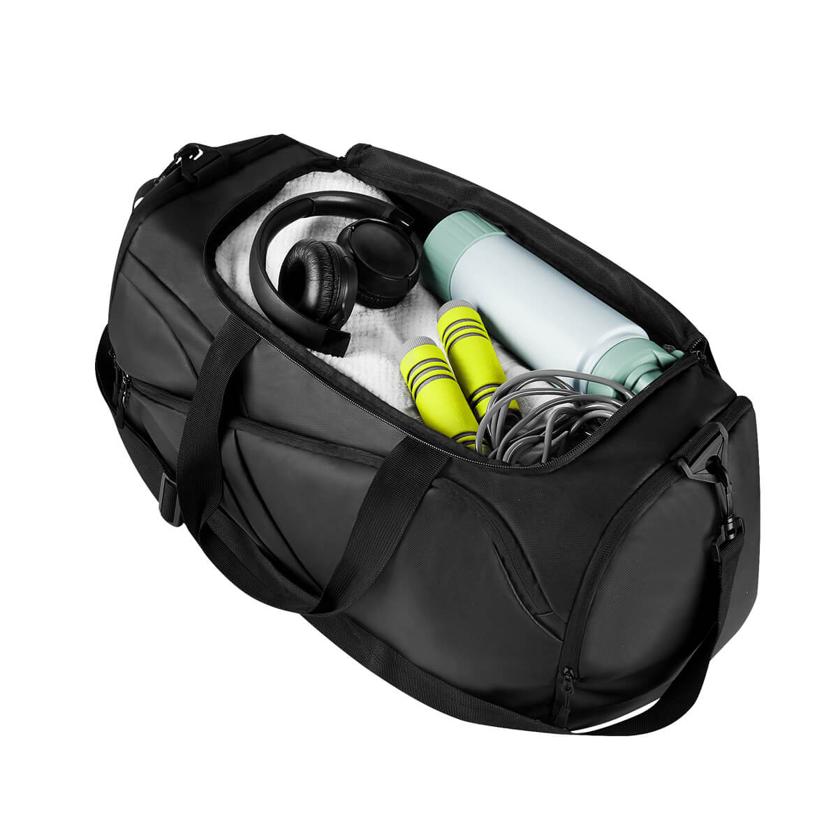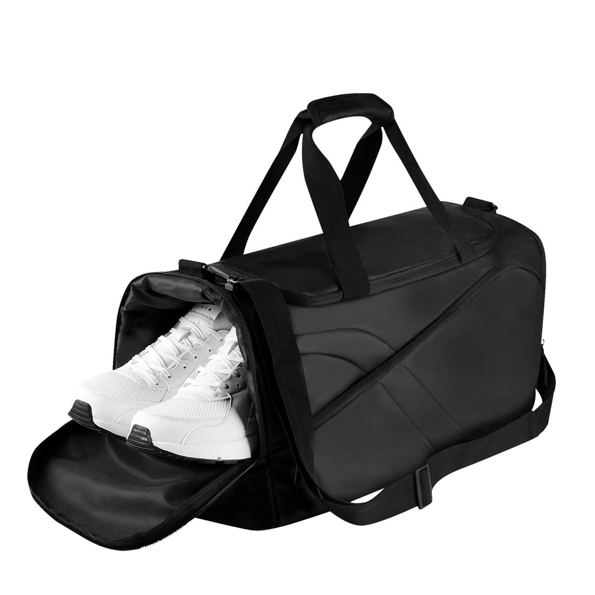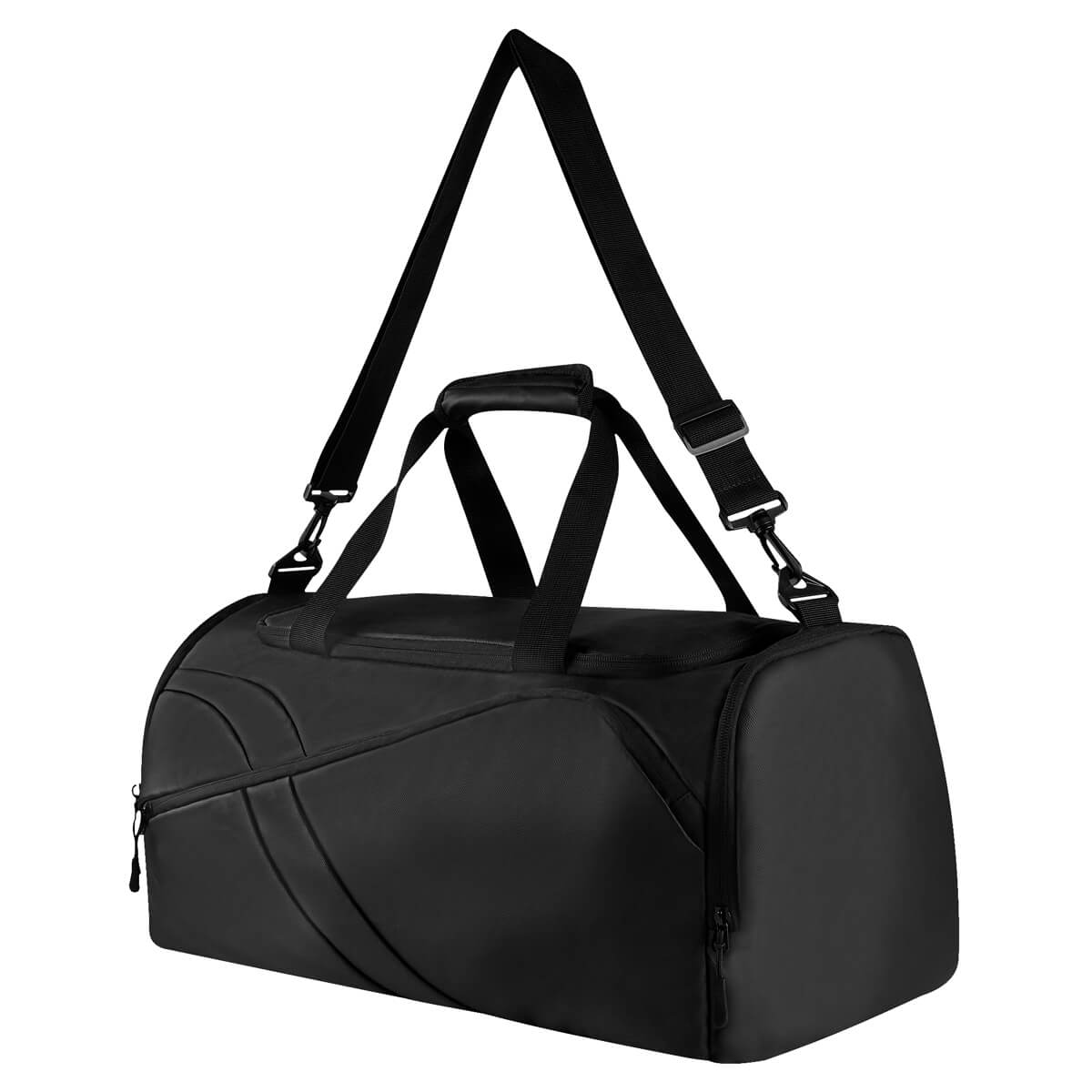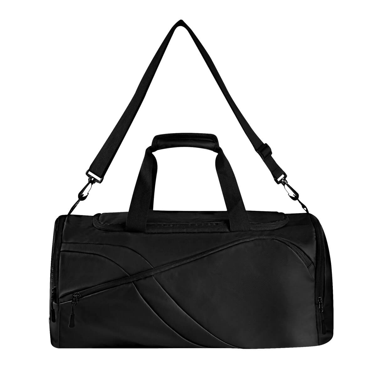 Maleta estilo deportivo. Compartimento principal con cierre. Bolsillo frontal con diseño asimétrico, que le otorga un toque distintivo de original diseño. Incluye bolsillo lateral con zapatera y un bolsillo lateral simple ideal para llevar pequeños objetos. Asas de mano para un fácil agarre y una práctica asa para hombro ajustable y removible, sujeta con broche de plástico para mayor seguridad. Esta maleta cuenta con el espacio y practicidad necesarios para llevar tus pertenencias de forma cómoda y segura a donde quiera que vayas, ideal para el gimnasio, viajes cortos o días cotidianos.