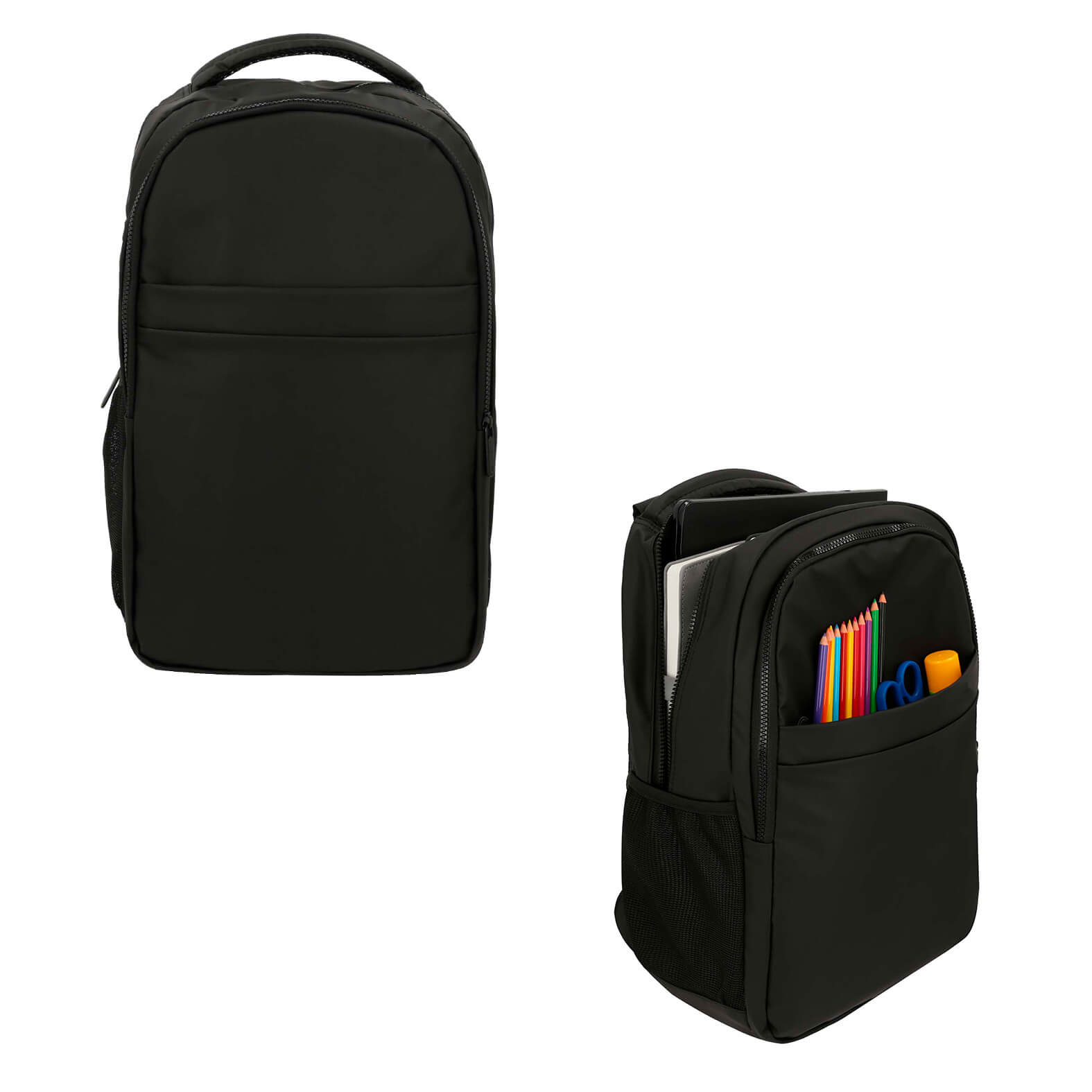 Mochila de 3 compartimentos, con porta laptop, asa en la parte superior y 2 bolsas con malla laterales.