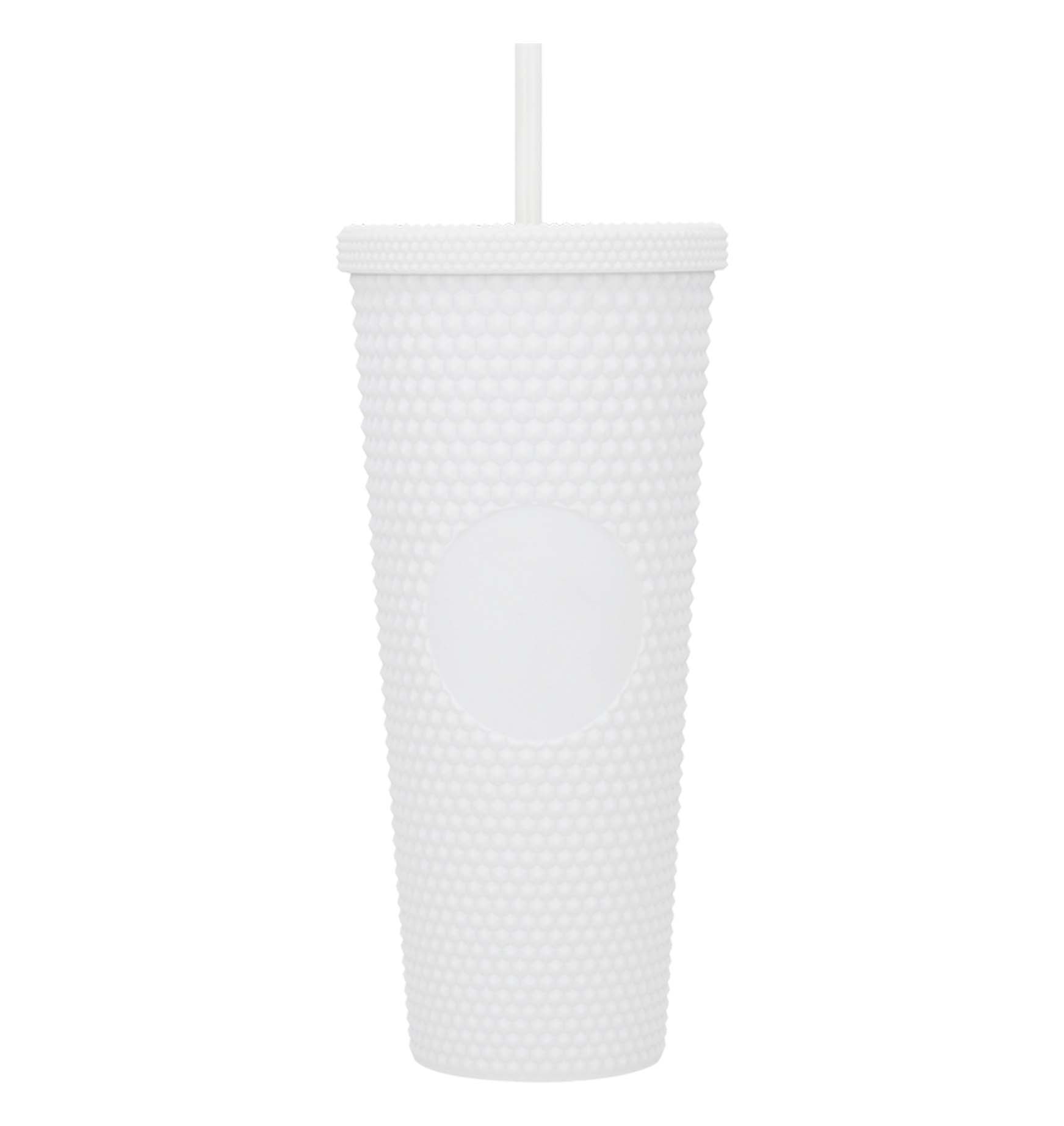 Vaso con doble pared de plástico, textura, tapa enroscable y popote incluido.