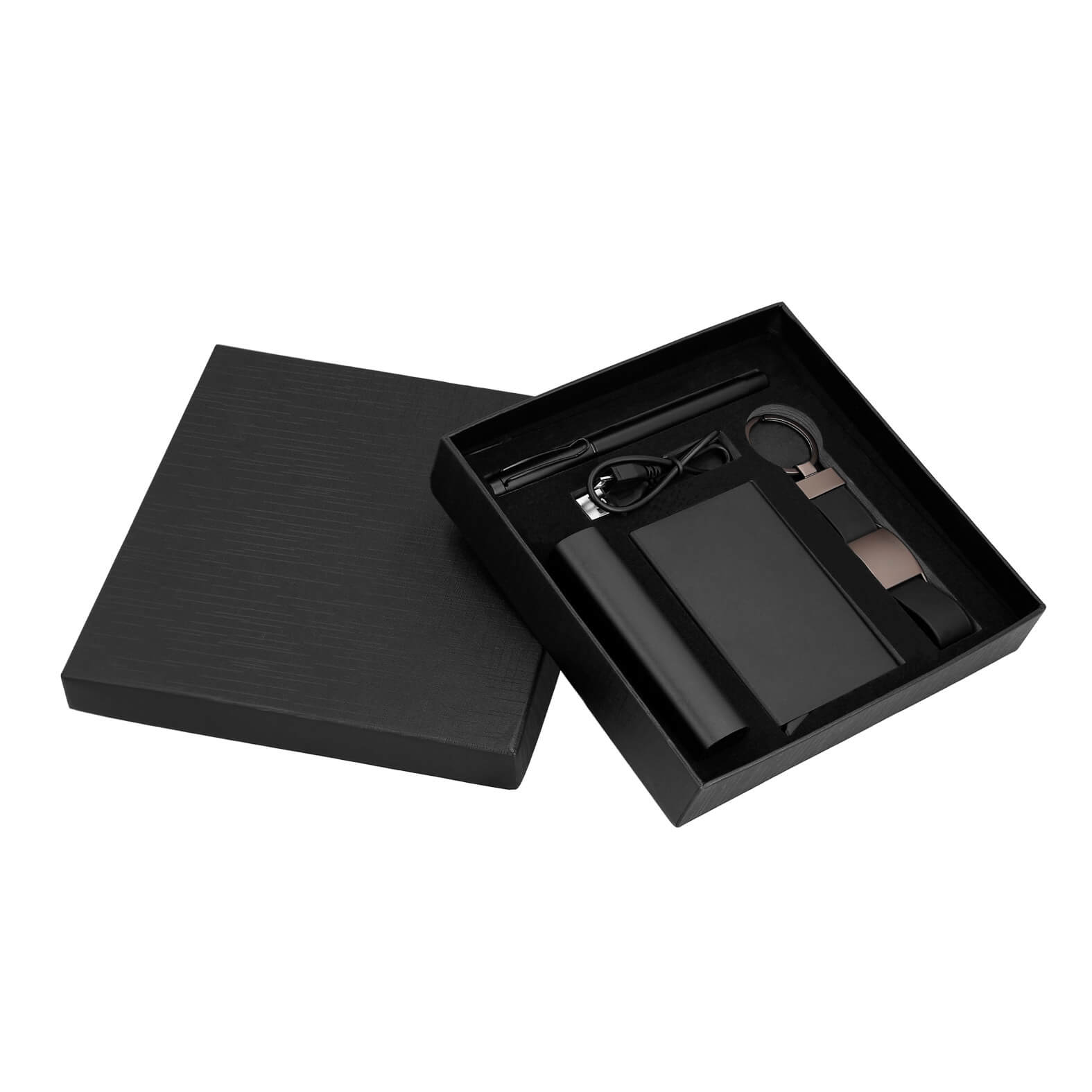 Set ejecutivo incluye: llavero metálico con correa, tarjetero metálico, pluma de metal con tinta gel, batería portátil de 2200 mAh con cable de carga y estuche de regalo.