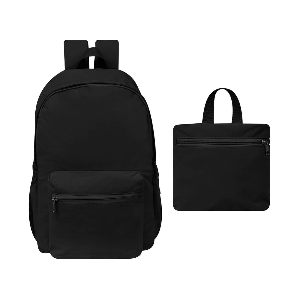 Mochila mágica con diseño multifuncional. Su bolsillo frontal te permite plegar toda la mochila, haciéndola compacta y fácil de guardar. Fabricada en nylon texturizado y suave al tacto. Cuenta con un compartimento principal con cierre, bolsillo interno y 2 bolsillos laterales con elástico. Incluye asa superior para transportar en mano y asas acolchadas con correas ajustables para mayor comodidad.