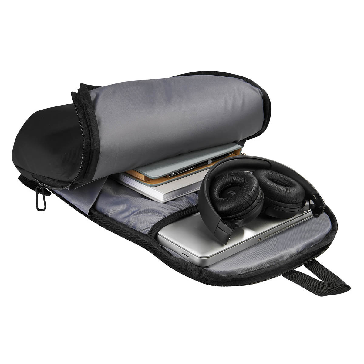 Bolsa principal con cierre y compartimento interior para laptop de hasta 15″. Incluye bolsillo frontal superior y bolsillo frontal con cierre cruzado. En la parte posterior cuenta con tirantes para hombro ajustables, respaldo acolchado y banda que facilita su transporte en trolley.