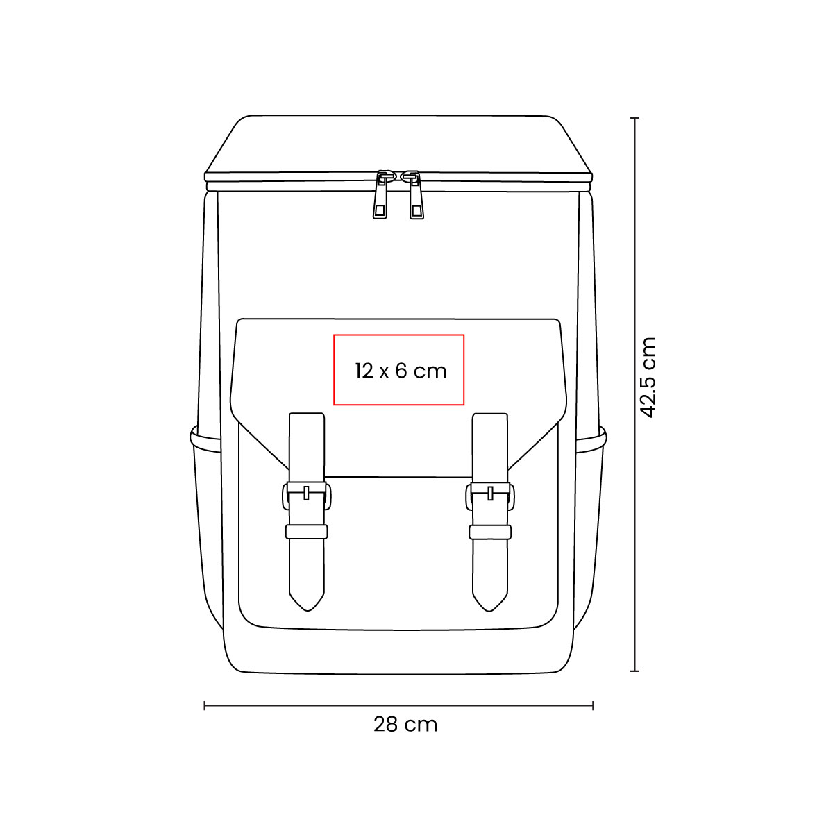 Interior plastificado. Compartimento interior removible impermeable. Bolsa principal, bolsa frontal y 2 bolsillos laterales. Broches frontales de hebilla metálica. Incluye destapador metálico. Capacidad para 24 latas.