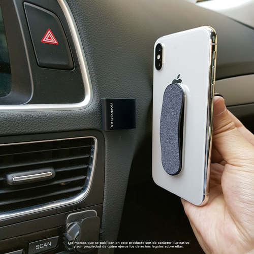 Momo clip con pegamento 3M doble cara, pega en cualquier superficie plana. Fácil deslizamiento con cualquier dispositivo que cuente con un Momo Stick.