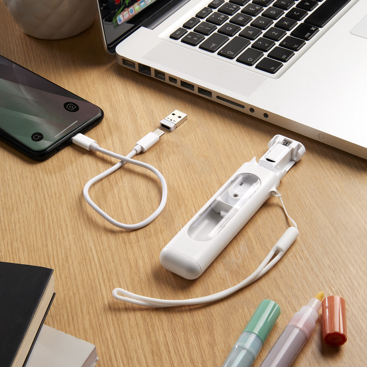 Kit de cable de conexión con adaptadores. Este kit permite tanto la carga rápida de tus dispositivos como la transferencia de datos, asegurando que siempre estés conectado. Equipado con adaptadores intercambiables, es compatible con una amplia gama de dispositivos, ofreciendo una solución integral para tus necesidades tecnológicas. Incluye cable de 25 cm de largo con doble conexión tipo C y permite una carga máxima de 60W. Incluye adaptador tipo C a micro USB, adaptador tipo C a lightning y adaptador USB a tipo C, permitiendo una carga máxima de 2.4A cada uno. Adicional, incorpora ranura para tarjeta SIM, ranura para tarjeta de memoria (no incluidas) y pin para expulsión de tarjeta SIM. Incluye caja individual.