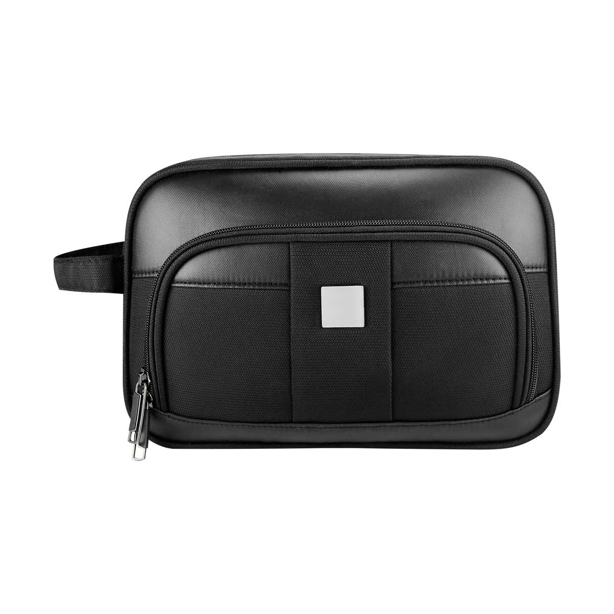 Neceser con cierre y asa en el exterior. Incluye compartimento frontal con doble cierre. Placa metálica removible para fácil grabado.