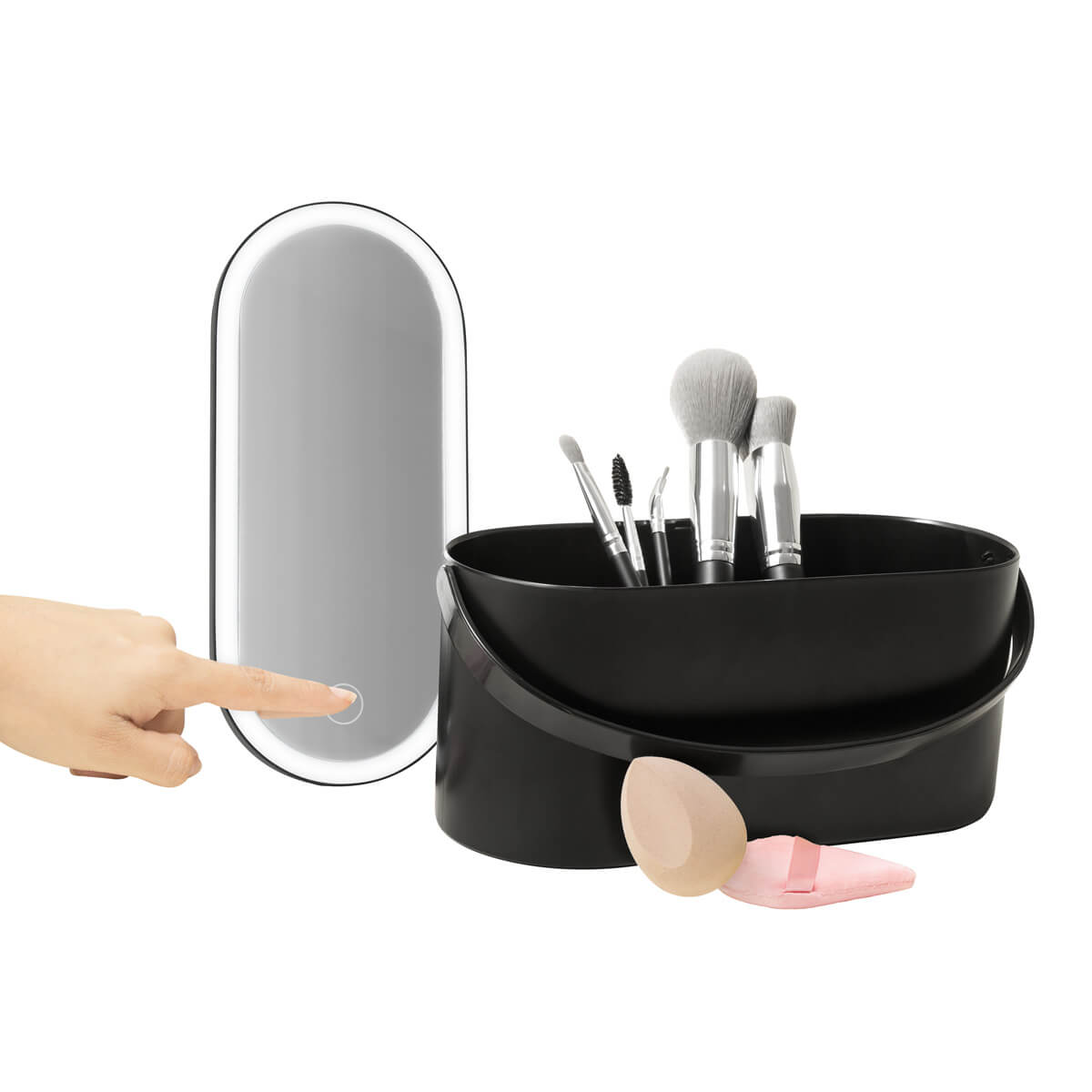 Organizador de cosméticos con espejo integrado. Su tapa incluye un espejo con luz LED ajustable a 3 intensidades, se activa presionando por 5 segundos el botón touch. El diseño versátil permite ajustar el espejo en diferentes posiciones, incluso desmontarlo y utilizarlo de manera individual, brindando comodidad y precisión al maquillarte. Compacto y elegante, es el accesorio ideal para mantener tus accesorios organizados. Batería recargable e incluye cable con conexión USB-C y caja individual.